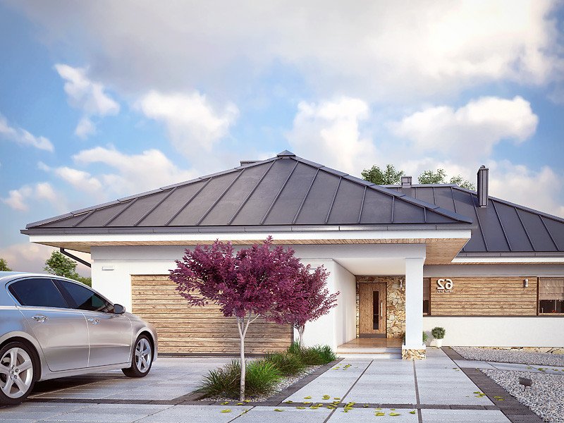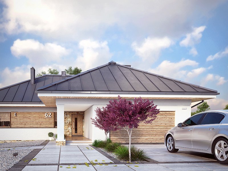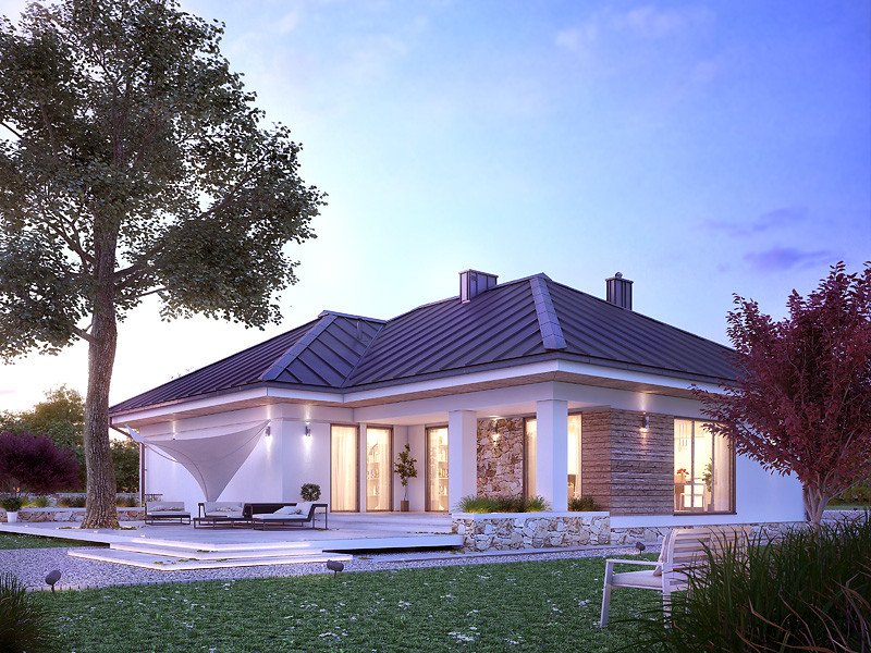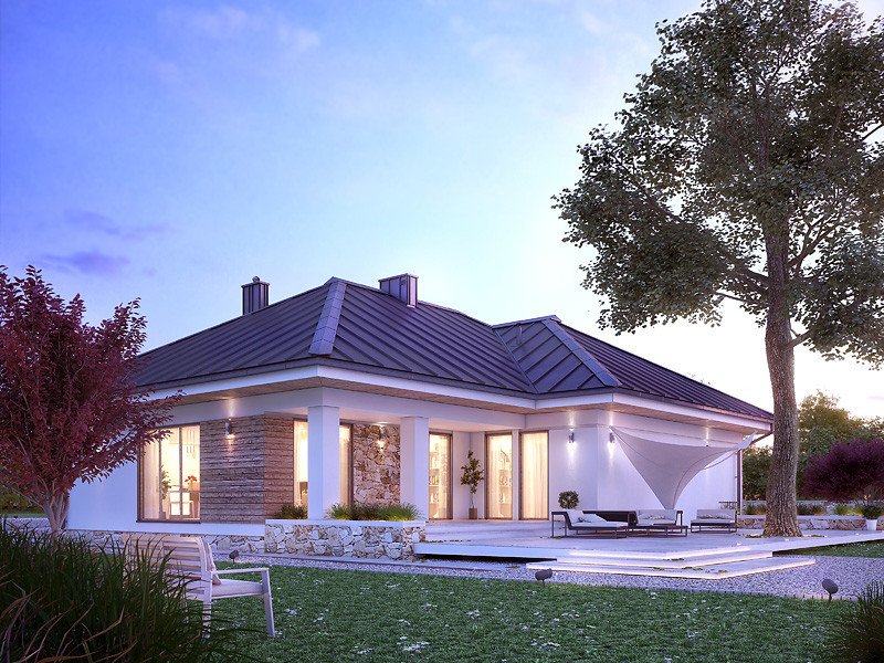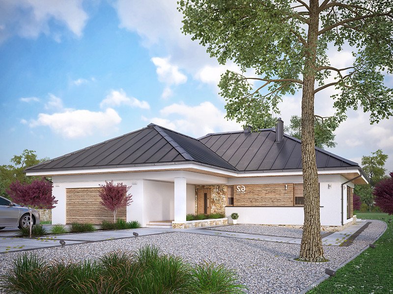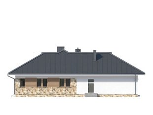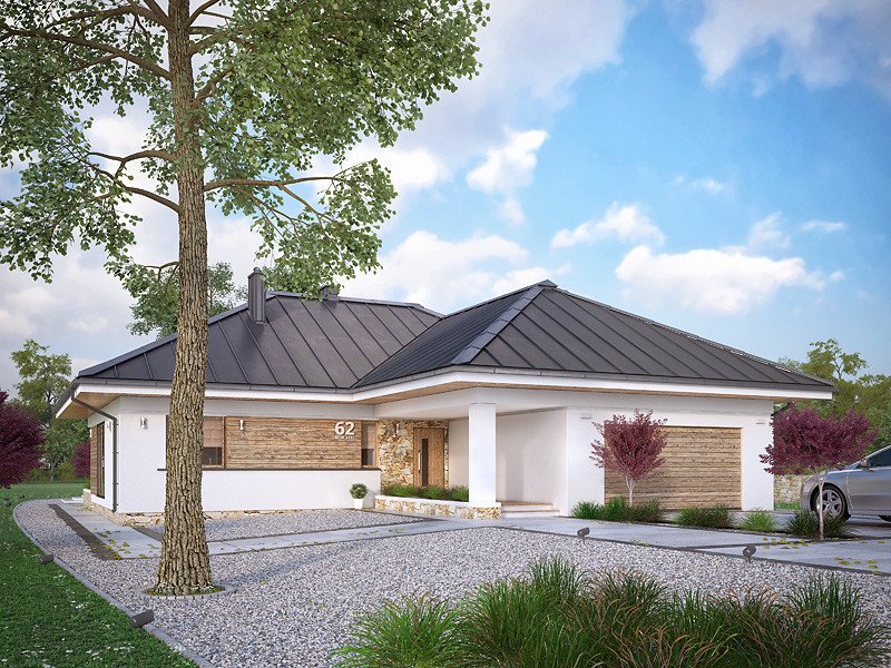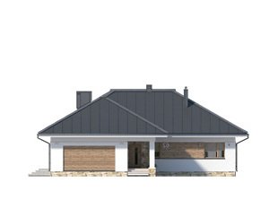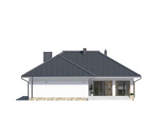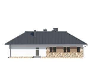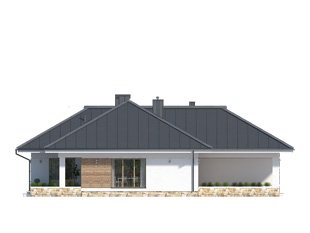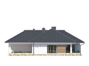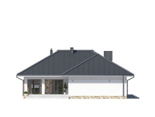 Parterowy budynek dla 4-osobowej rodziny. Przejrzysty układ funkcjonalny z podziałem na część dzienną z otwartą kuchnią i przytulną strefę prywatną. Garderoba, spiżarnia i pomieszczenie gospodarcze zapewniają dodatkową przestrzeń magazynową. Komfort użytkowania podnosi dodatkowa łazienka i garderoba dostępne z sypialni. Zadaszony taras pozwala na przebywanie na świeżym powietrzu niezależnie od warunków atmosferycznych