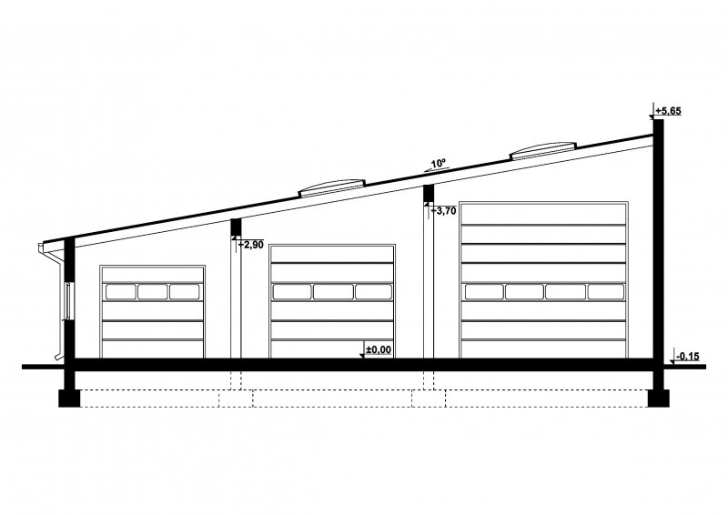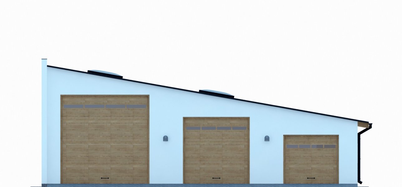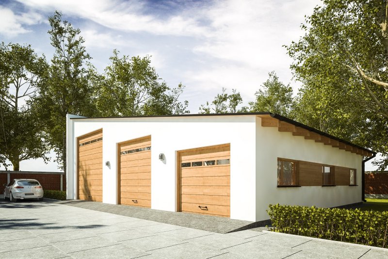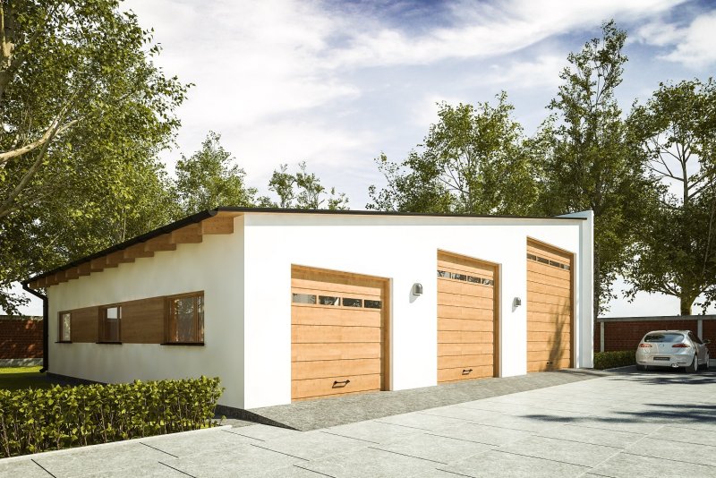 Projekt garażu trzystanowiskowego, parterowego, przeznaczonego dla samochodów ciężarowych, dostawczych i osobowych z pomieszczeniem gospodarczym. Do projektu dołączone jest zestawienie: stali, więźby dachowej oraz stolarki drzwiowej i okiennej, jak również bezpłatna zgoda na dokonanie zmian.