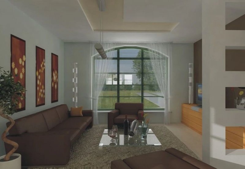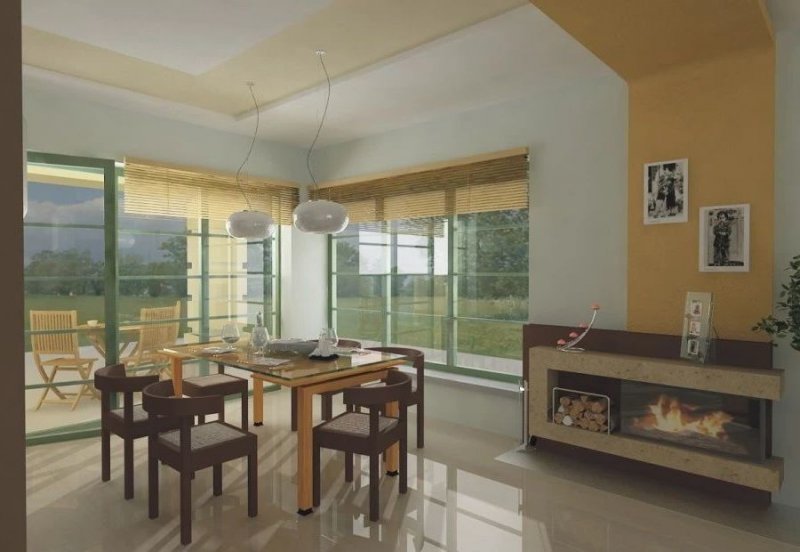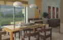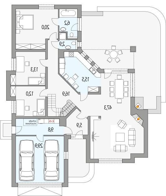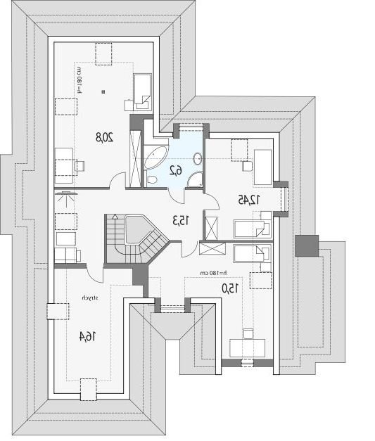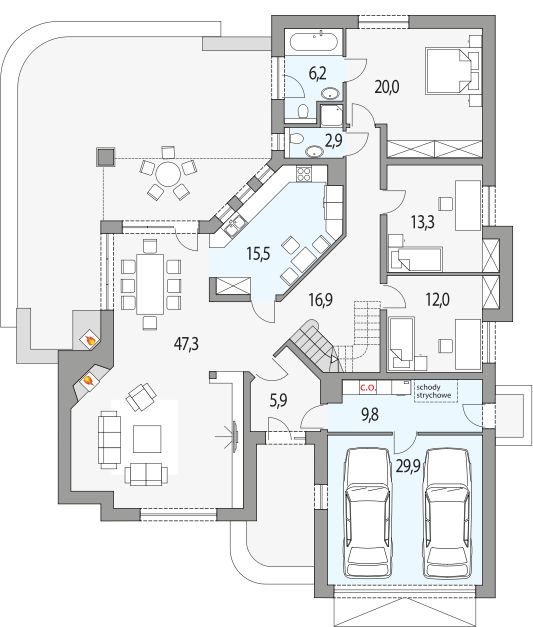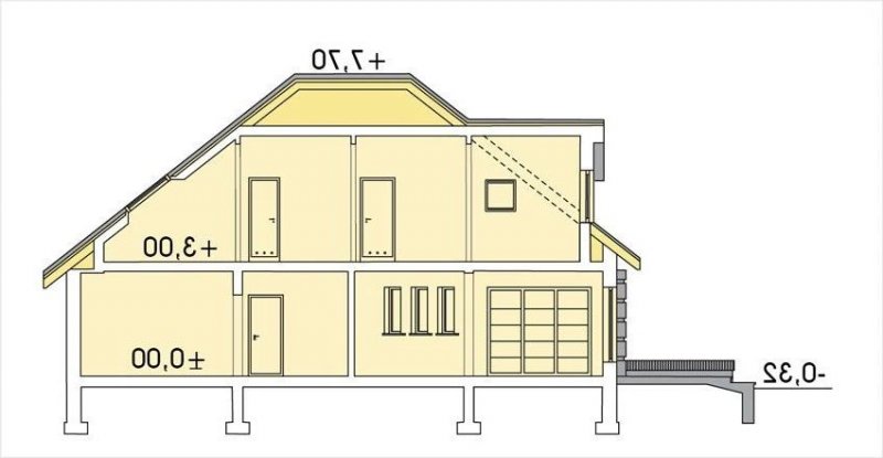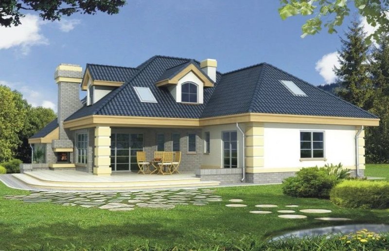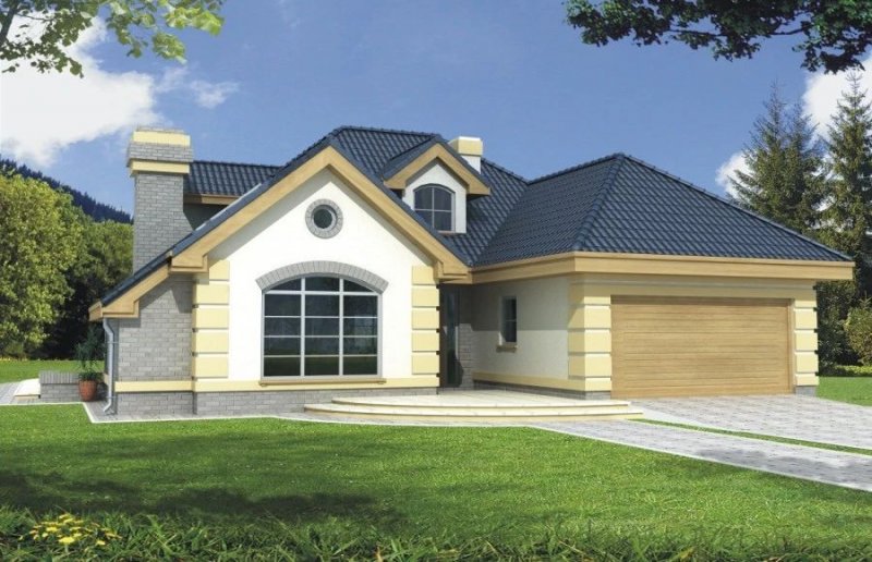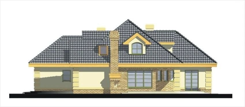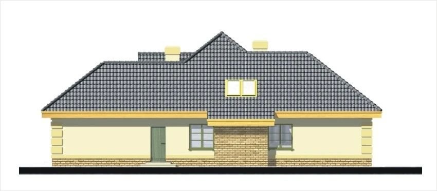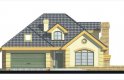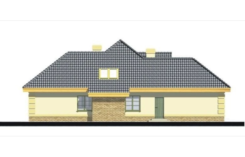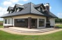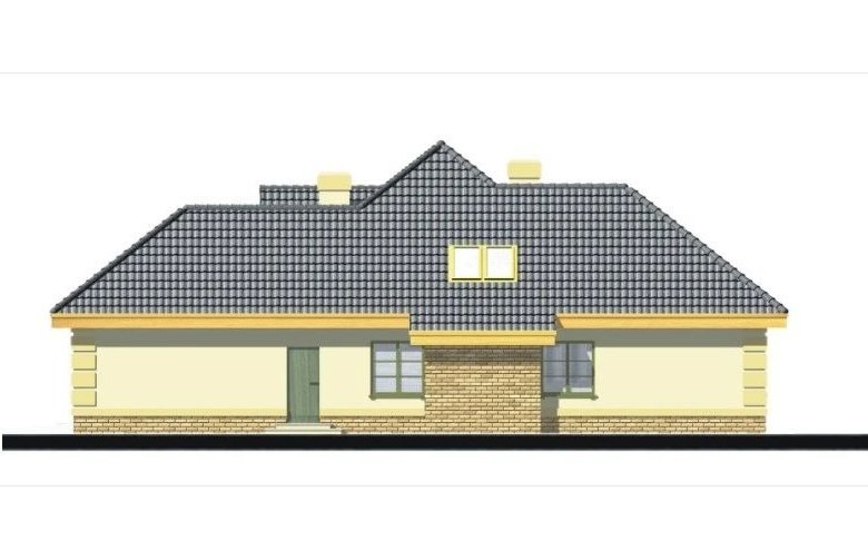 Elegancki dom przeznaczony dla 4-6-osobowej rodziny. Niepodpiwniczony z poddaszem użytkowym. Na parterze w części dziennej dominującą rolę spełnia salon z pięknym kominkiem. Doświetlenie pokoju dziennego od strony wjazdu pozwala umiejscowić dom również na działce z wjazdem od południa. Duże okna zapewniają przenikanie się domu z ogrodem. Podobną funkcję spełniają drzwi na taras z łazienki koło sypialni - można ją ciekawie zaaranżować jako pokój kąpielowy. Trzy sypialnie na parterze pozwalają na etapowanie budowy i wykończenie poddasza w późniejszym terminie.