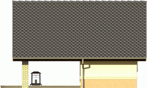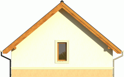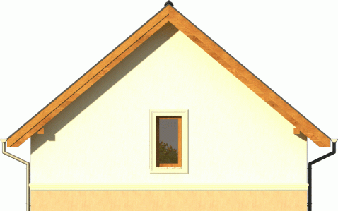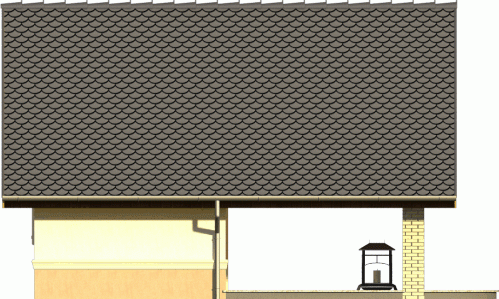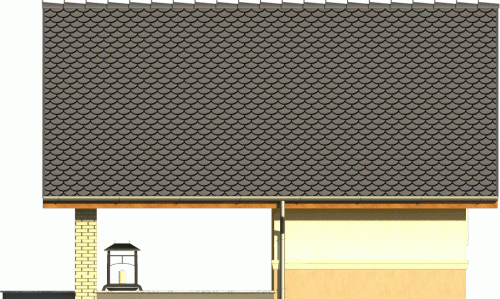 Propozycja niewielkiego budynku z dachem dwuspadowym, ustawionego szczytem do frontu. Ozdobą jest widoczna drewniana więźba wsparta na klinkierowych ściankach przy tarasie. Doskonale komponuje się z całością też zwieńczony gzymsem cokół, wyodrębniony dodatkowo kontrastowym kolorem tynku.