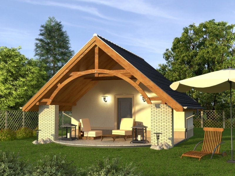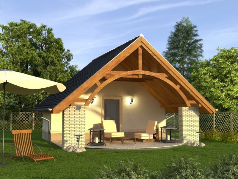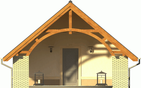 Budynek niepodpiwniczony, parterowy. Urocza altana z przestronnym tarasem wejściowym. Bardzo ekonomiczny budynek bez stropu z częściowo skośnymi połaciami dachu wewnątrz. Dokumentacja dostępna również w odbiciu lustrzanym.