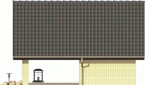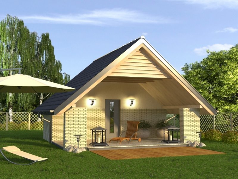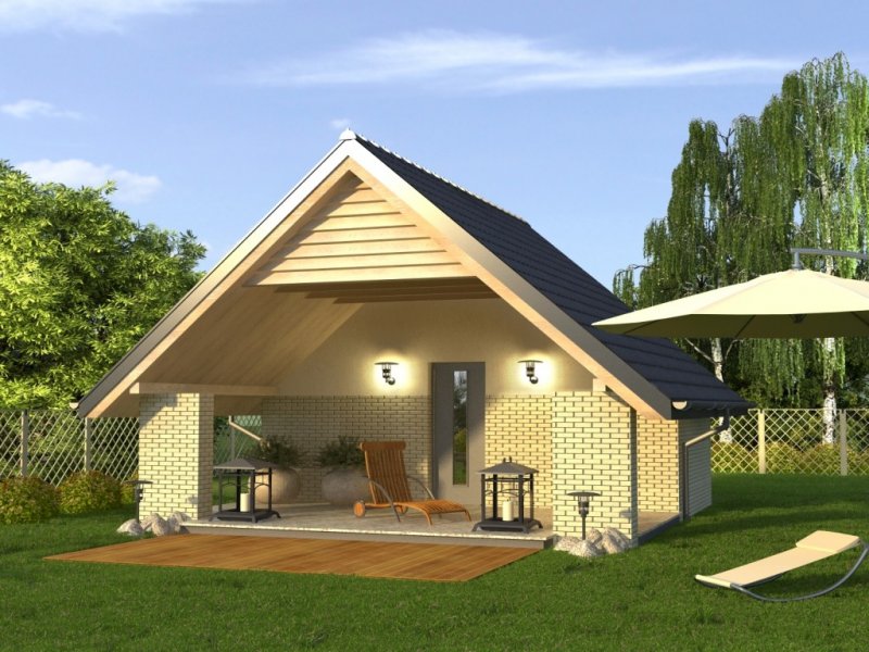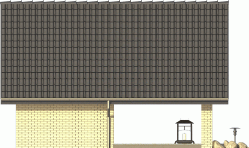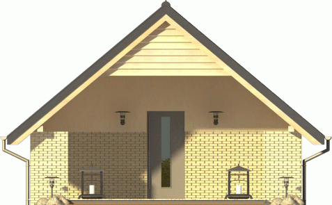 Budynek niepodpiwniczony, parterowy. Atrakcyjna altana z dużym tarasem wejściowym. Ekonomiczny budynek bez stropu z częściowo skośnymi połaciami dachu wewnątrz. Dokumentacja dostępna również w odbiciu lustrzanym.