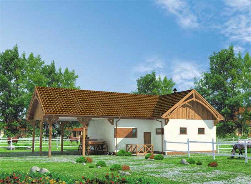Budynek gospodarczy z trzema pomieszczeniami , łazienką i wiatą.