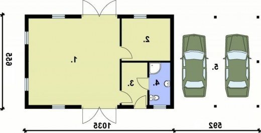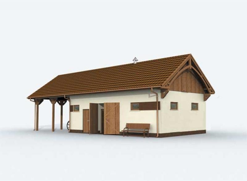 Budynek gospodarczy z trzema pomieszczeniami, z wiatą garażową dwustanowiskową, łazienką i poddaszem użytkowym. Może również pełnić funkcję magazynową. Projekt składa się z części architektonicznej, konstrukcyjnej, wewnętrznej instalacji wod-kan. i wewnętrznej instalacji elektrycznej. W projekcie załączone są podstawowe zestawienie stali, drewna i stolarki okienno-drzwiowej. Do projektu dołączone są: bezpłatna zgoda na wprowadzenie zmian, oświadczenie projektantów o wykonaniu projektu zgodnie z obowiązującymi normami i przepisami oraz kserokopie uprawnień projektantów wraz z aktualnym wpisem do izby. W przypadku zamówienia projektu w technologii lekkiej, drewnianej konstrukcji szkieletowej, powierzchnia użytkowa budynku jest o około 7% większa.