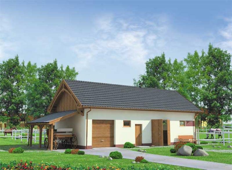 Budynek gospodarczy z czterema pomieszczeniami, łazienką i z wiatą.