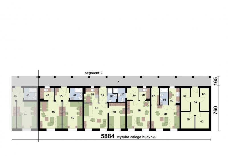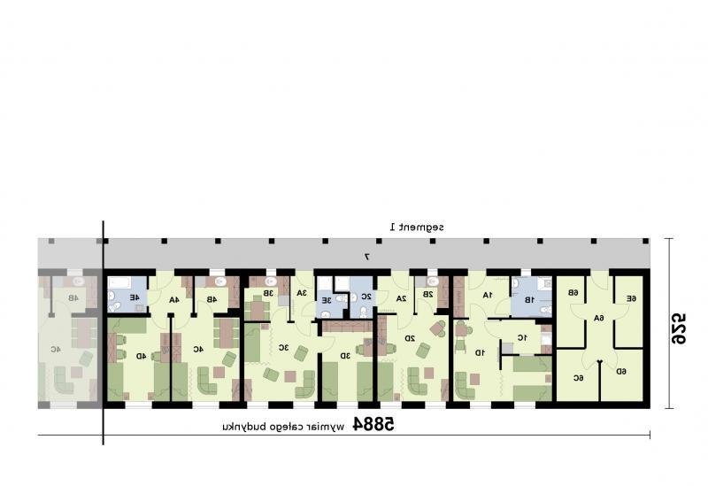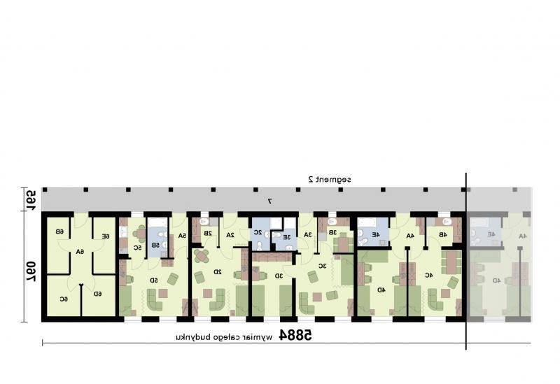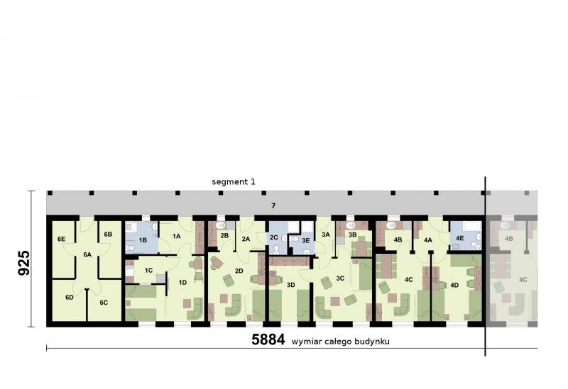 Budynek składa się z 8 samowystarczalnych segmentów, każdy z nich dysponuje osobnym wejściem, toaletą oraz aneksem kuchennym. Na segment składają się pokoje 3 i 4 osobowe. Drzwi mieszkań wychodzą na ciągnącą się przez całą długość budynku werandę. Zachęcamy inwestorów do wybrania właśnie tego projektu przemyślanych mieszkań socjalnych.