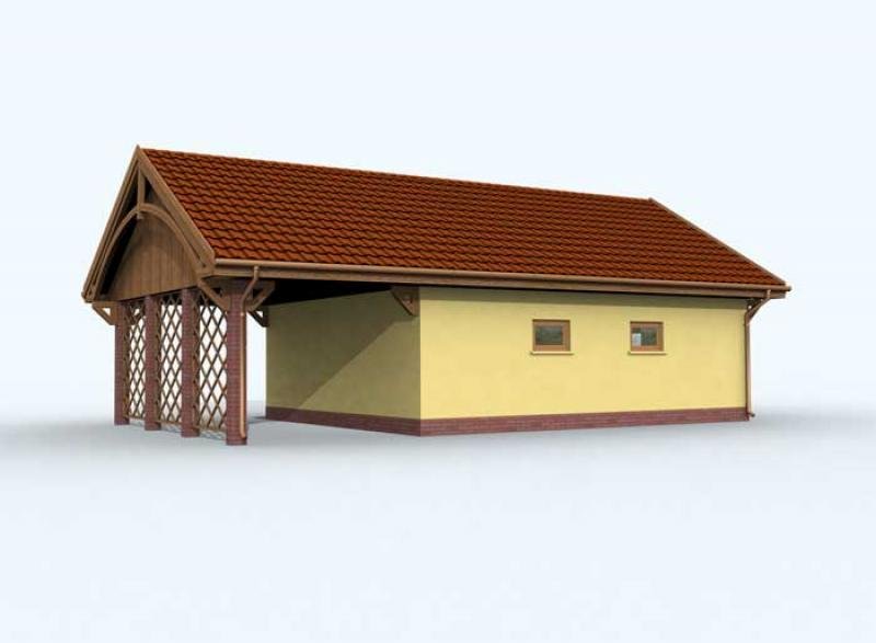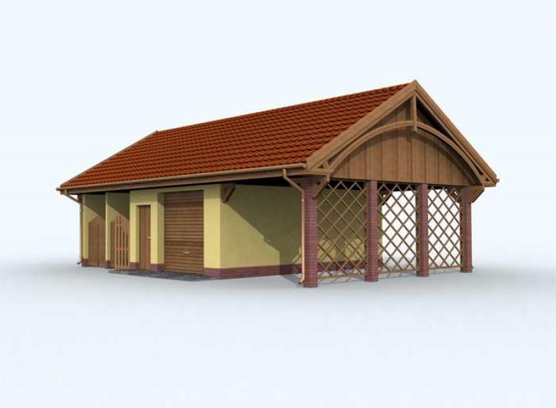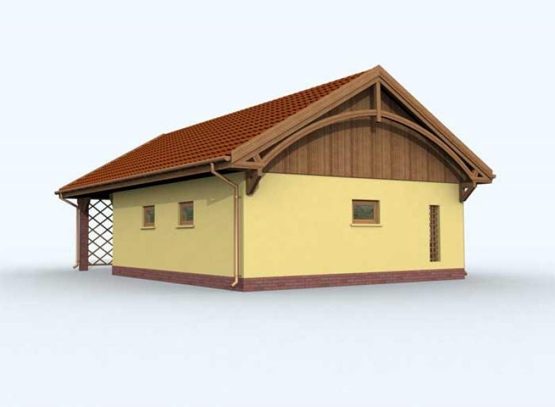 Budynek gospodarczy, wolnostojący. Projekt składa się z części architektonicznej, konstrukcyjnej i wewnętrznej instalacji elektrycznej. W projekcie załączone są podstawowe zestawienie stali, drewna i stolarki okienno-drzwiowej. Do projektu dołączamy bezpłatną zgodę na wprowadzenie zmian, oświadczenie projektantów o wykonaniu projektu zgodnie z obowiązującymi normami i przepisami oraz kserokopie uprawnień projektantów wraz z aktualnym wpisem do izby. W przypadku zamówienia projektu w technologii lekkiej, drewnianej konstrukcji szkieletowej, powierzchnia użytkowa budynku jest o około 7% większa.