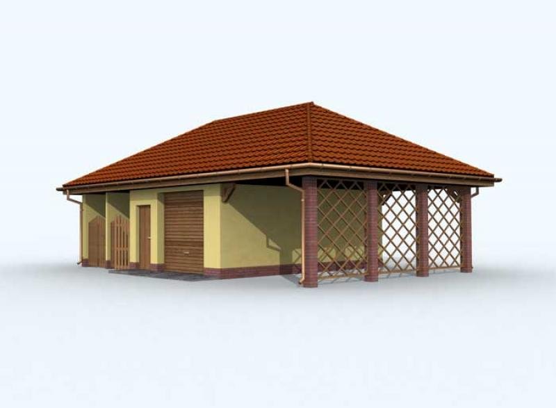 Budynek gospodarczy, wolnostojący. Projekt składa się z części architektonicznej, konstrukcyjnej i wewnętrznej instalacji elektrycznej. W projekcie załączone są podstawowe zestawienie stali, drewna i stolarki okienno-drzwiowej. Do projektu dołączamy bezpłatną zgodę na wprowadzenie zmian, oświadczenie projektantów o wykonaniu projektu zgodnie z obowiązującymi normami i przepisami oraz kserokopie uprawnień projektantów wraz z aktualnym wpisem do izby. W przypadku zamówienia projektu w technologii lekkiej, drewnianej konstrukcji szkieletowej, powierzchnia użytkowa budynku jest o około 7% większa.