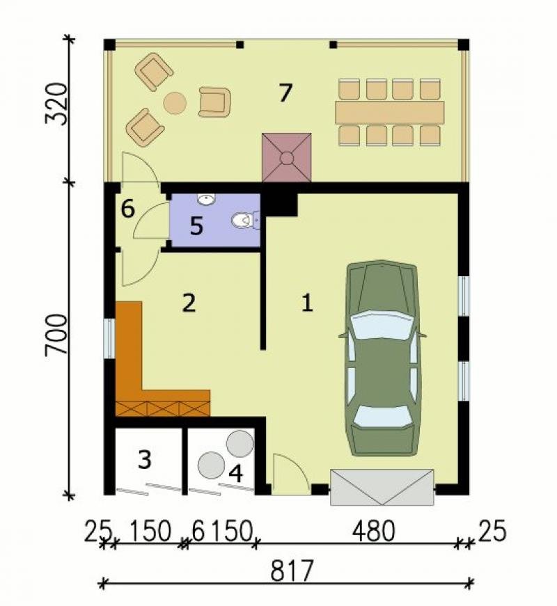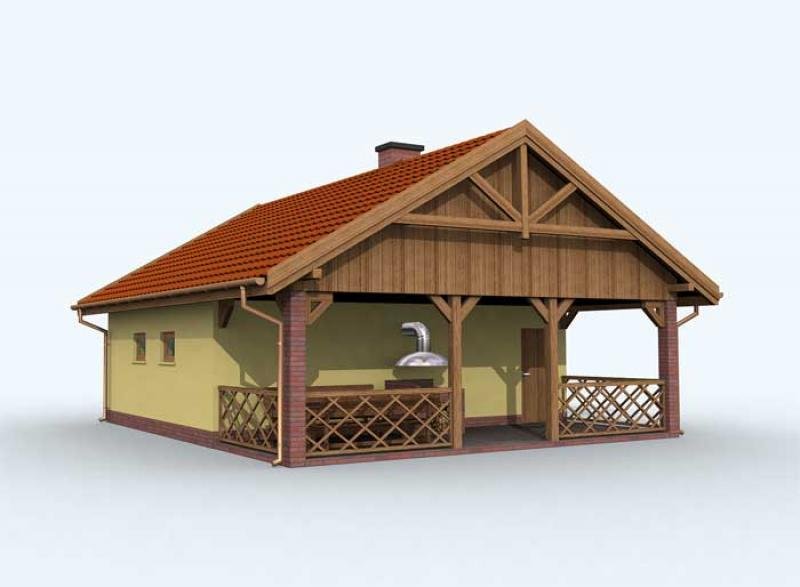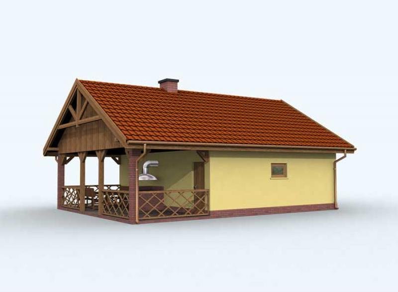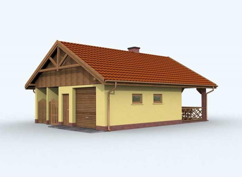 Budynek gospodarczy, wolnostojący. Projekt składa się z części architektonicznej, konstrukcyjnej i wewnętrznej instalacji elektrycznej. W projekcie załączone są podstawowe zestawienie stali, drewna i stolarki okienno-drzwiowej. Do projektu dołączamy bezpłatną zgodę na wprowadzenie zmian, oświadczenie projektantów o wykonaniu projektu zgodnie z obowiązującymi normami i przepisami oraz kserokopie uprawnień projektantów wraz z aktualnym wpisem do izby. W przypadku zamówienia projektu w technologii lekkiej, drewnianej konstrukcji szkieletowej, powierzchnia użytkowa budynku jest o około 7% większa.