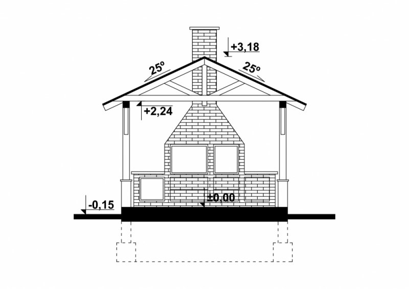 Budynek konstrukcji drewnianej. Grill z cegły ceramicznej pełnej. Więźba dachowa dwuspadowa, drewniana, pokryta blachodachówką.