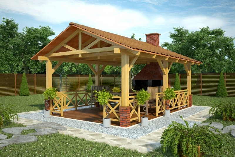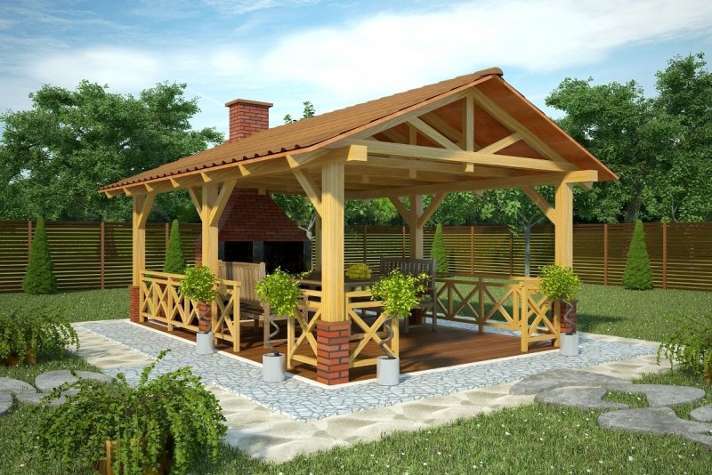 Projekt altany ogrodowej z grillem. Do projektu dołączone jest zestawienie: podstawowych materiałów konstrukcyjnych i więźby dachowej, jak równieżbezpłatna zgoda na dokonanie zmian.