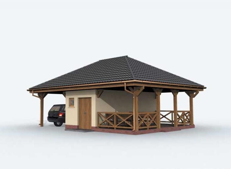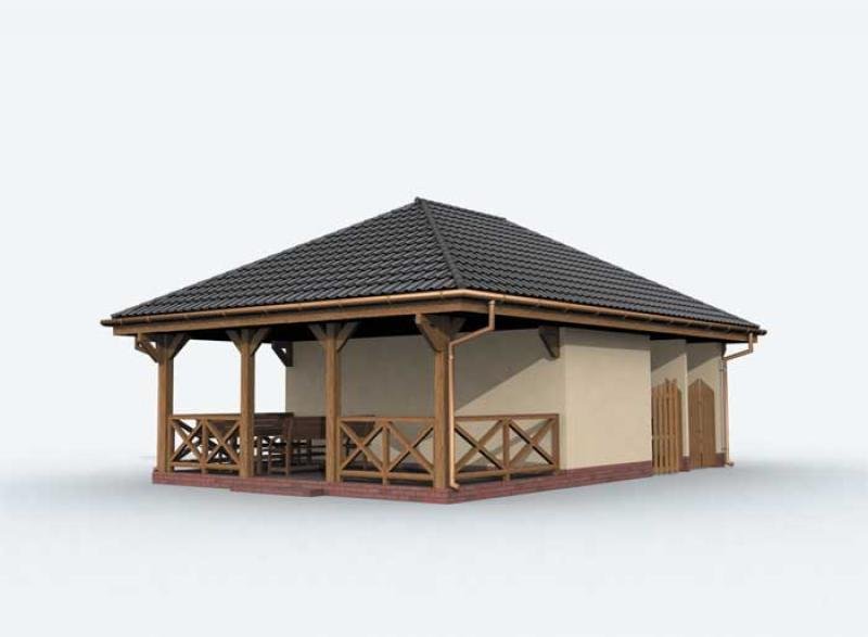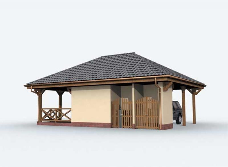 Budynek gospodarczy, wolnostojący. Projekt składa się z części architektonicznej, konstrukcyjnej i wewnętrznej instalacji elektrycznej. W projekcie załączone są podstawowe zestawienie stali, drewna i stolarki okienno-drzwiowej. Do projektu dołączamy bezpłatną zgodę na wprowadzenie zmian, oświadczenie projektantów o wykonaniu projektu zgodnie z obowiązującymi normami i przepisami oraz kserokopie uprawnień projektantów wraz z aktualnym wpisem do izby. W przypadku zamówienia projektu w technologii lekkiej, drewnianej konstrukcji szkieletowej, powierzchnia użytkowa budynku jest o około 7% większa.
