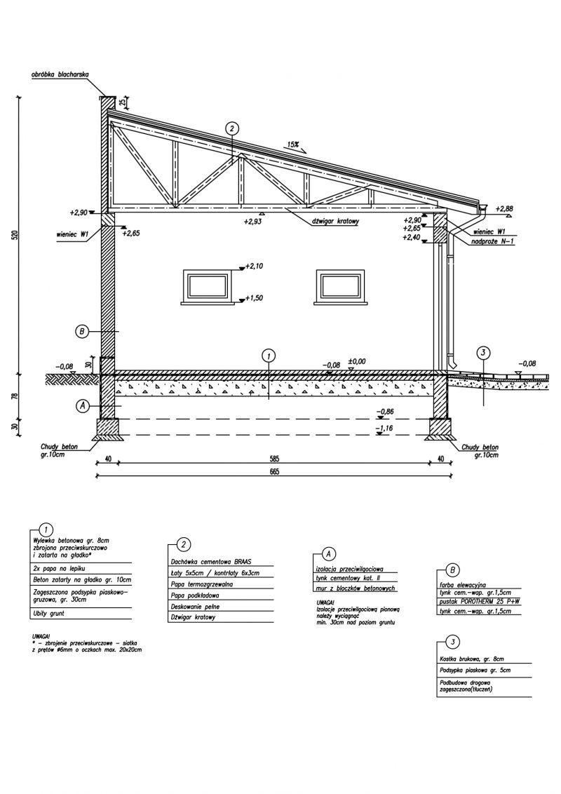 Technologia tradycyjna , ściany murowane grubości 25 cm. Konstrukcja więźby dachowej drewniana, pokrycie dachówka ceramiczna. Projekt garażu składa się z czterech egzemplarzy a w tym części architektonicznej, konstrukcyjnej i instalacji wewnętrznej elektrycznej. W projekcie załączone są podstawowe zestawienie stali, drewna i stolarki okienno-drzwiowej. Do projektu dołączamy bezpłatną zgodę na wprowadzenie zmian, oświadczenie projektantów o wykonaniu projektu zgodnie z obowiązującymi normami i przepisami oraz kserokopie uprawnień projektantów wraz z aktualnym wpisem do izby.