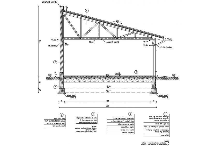 Budynek gospodarczy, wolnostojący. Projekt składa się z części architektonicznej, konstrukcyjnej i wewnętrznej instalacji elektrycznej. W projekcie załączone są podstawowe zestawienie stali, drewna i stolarki okienno-drzwiowej. Do projektu dołączamy bezpłatną zgodę na wprowadzenie zmian, oświadczenie projektantów o wykonaniu projektu zgodnie z obowiązującymi normami i przepisami oraz kserokopie uprawnień projektantów wraz z aktualnym wpisem do izby. W przypadku zamówienia projektu w technologii lekkiej, drewnianej konstrukcji szkieletowej, powierzchnia użytkowa budynku jest o około 7% większa.