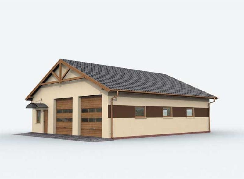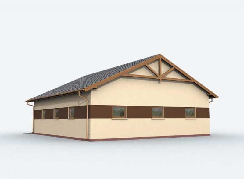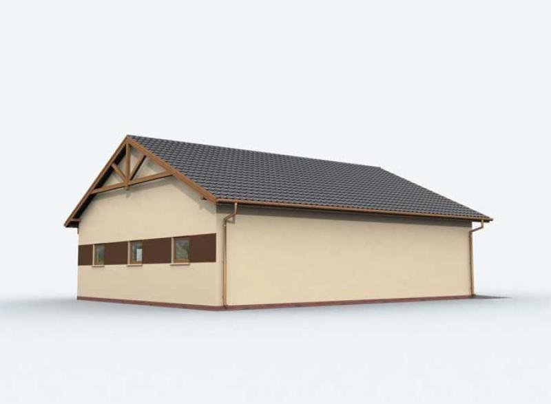 Budynek gospodarczy, wolnostojący. Projekt składa się z części architektonicznej, konstrukcyjnej i wewnętrznej instalacji elektrycznej. W projekcie załączone są podstawowe zestawienie stali, drewna i stolarki okienno-drzwiowej. Do projektu dołączamy bezpłatną zgodę na wprowadzenie zmian, oświadczenie projektantów o wykonaniu projektu zgodnie z obowiązującymi normami i przepisami oraz kserokopie uprawnień projektantów wraz z aktualnym wpisem do izby. W przypadku zamówienia projektu w technologii lekkiej, drewnianej konstrukcji szkieletowej, powierzchnia użytkowa budynku jest o około 7% większa.