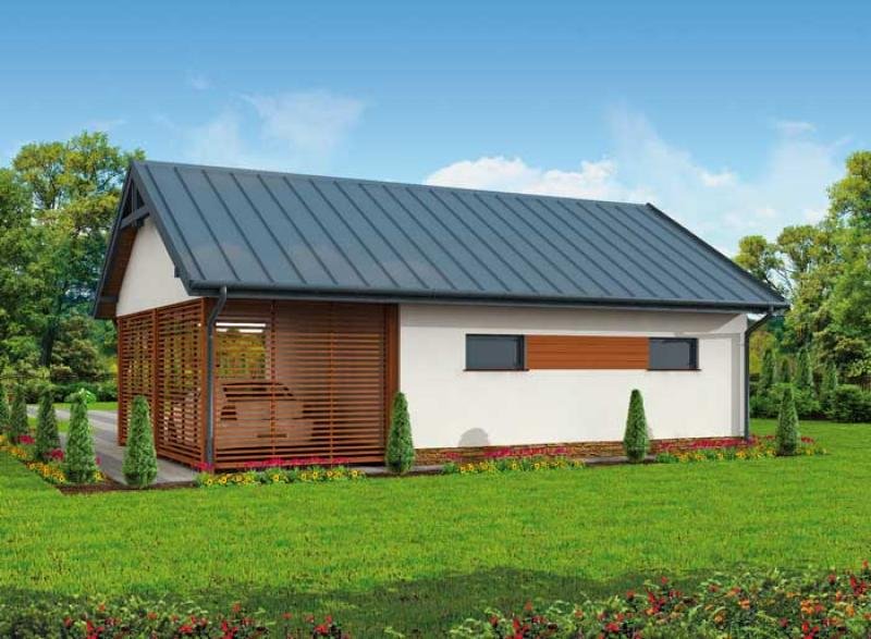 Budynek gospodarczy, wolnostojący. Projekt składa się z części architektonicznej, konstrukcyjnej i wewnętrznej instalacji elektrycznej. W projekcie załączone są podstawowe zestawienie stali, drewna i stolarki okienno-drzwiowej. Do projektu dołączamy bezpłatną zgodę na wprowadzenie zmian, oświadczenie projektantów o wykonaniu projektu zgodnie z obowiązującymi normami i przepisami oraz kserokopie uprawnień projektantów wraz z aktualnym wpisem do izby. W przypadku zamówienia projektu w technologii lekkiej, drewnianej konstrukcji szkieletowej, powierzchnia użytkowa budynku jest o około 7% większa.