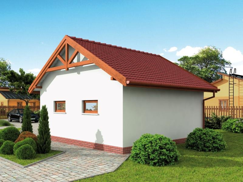 Budynek gospodarczy, wolnostojący. Projekt składa się z części architektonicznej, konstrukcyjnej i wewnętrznej instalacji elektrycznej. W projekcie załączone są podstawowe zestawienie stali, drewna i stolarki okienno-drzwiowej. Do projektu dołączamy bezpłatną zgodę na wprowadzenie zmian, oświadczenie projektantów o wykonaniu projektu zgodnie z obowiązującymi normami i przepisami oraz kserokopie uprawnień projektantów wraz z aktualnym wpisem do izby. W przypadku zamówienia projektu w technologii lekkiej, drewnianej konstrukcji szkieletowej, powierzchnia użytkowa budynku jest o około 7% większa.
