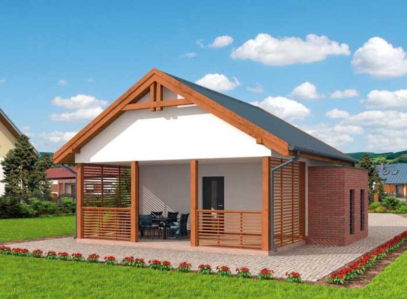 Budynek gospodarczy z werandą i z pomieszczeniem na drewno i odpadki. Projekt składa się z części architektonicznej, konstrukcyjnej i wewnętrznej instalacji elektrycznej. W projekcie załączone są podstawowe zestawienie stali, drewna i stolarki okienno-drzwiowej. Do projektu dołączamy bezpłatną zgodę na wprowadzenie zmian, oświadczenie projektantów o wykonaniu projektu zgodnie z obowiązującymi normami i przepisami oraz kserokopie uprawnień projektantów wraz z aktualnym wpisem do izby. W przypadku zamówienia projektu w technologii lekkiej, drewnianej konstrukcji szkieletowej, powierzchnia użytkowa budynku jest o około 7% większa.
