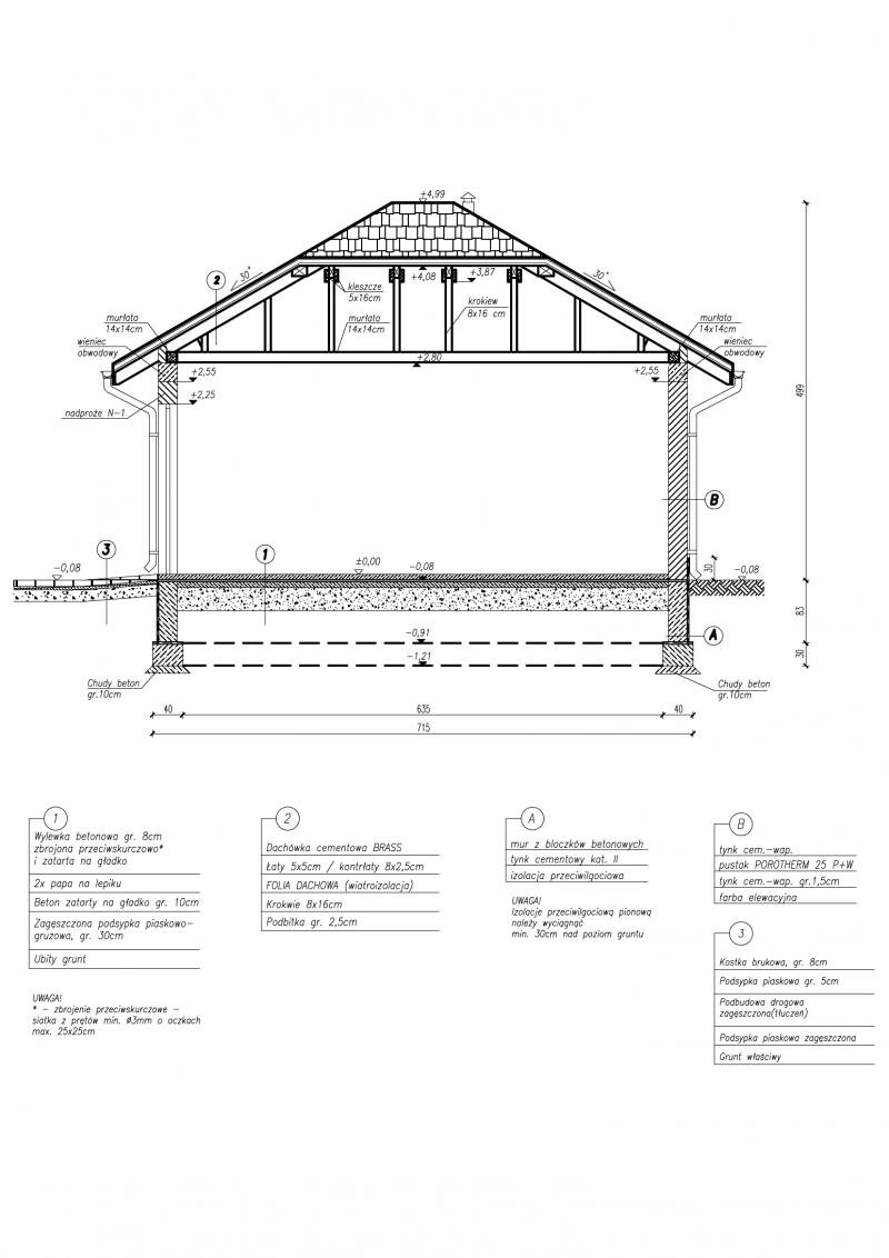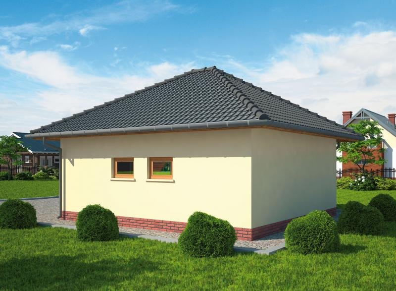 Budynek gospodarczy, wolnostojący. Projekt składa się z części architektonicznej, konstrukcyjnej i wewnętrznej instalacji elektrycznej. W projekcie załączone są podstawowe zestawienie stali, drewna i stolarki okienno-drzwiowej. Do projektu dołączamy bezpłatną zgodę na wprowadzenie zmian, oświadczenie projektantów o wykonaniu projektu zgodnie z obowiązującymi normami i przepisami oraz kserokopie uprawnień projektantów wraz z aktualnym wpisem do izby. W przypadku zamówienia projektu w technologii lekkiej, drewnianej konstrukcji szkieletowej, powierzchnia użytkowa budynku jest o około 7% większa.