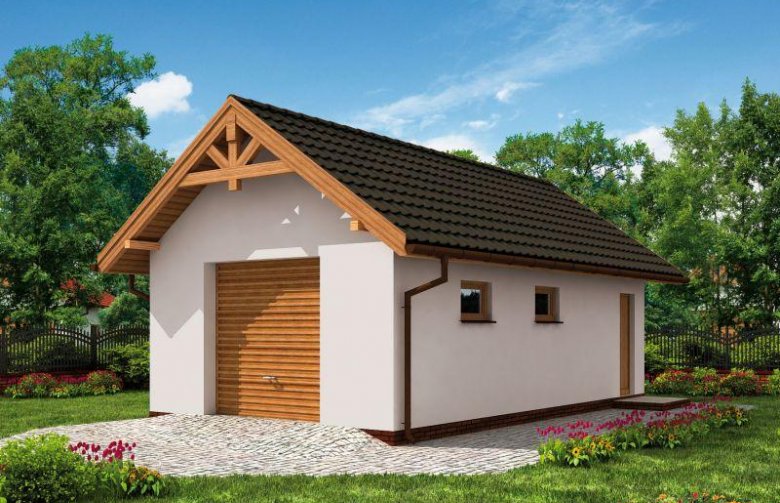 Garaż jednostanowiskowyw technologii szkieletowej, wolnostojący, parterowy.