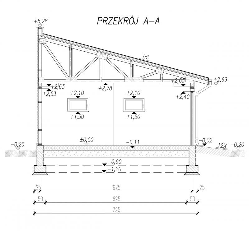 Budynek gospodarczy, wolnostojący. Projekt składa się z części architektonicznej, konstrukcyjnej i wewnętrznej instalacji elektrycznej. W projekcie załączone są podstawowe zestawienie stali, drewna i stolarki okienno-drzwiowej. Do projektu dołączamy bezpłatną zgodę na wprowadzenie zmian, oświadczenie projektantów o wykonaniu projektu zgodnie z obowiązującymi normami i przepisami oraz kserokopie uprawnień projektantów wraz z aktualnym wpisem do izby. W przypadku zamówienia projektu w technologii lekkiej, drewnianej konstrukcji szkieletowej, powierzchnia użytkowa budynku jest o około 7% większa.