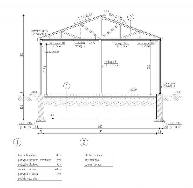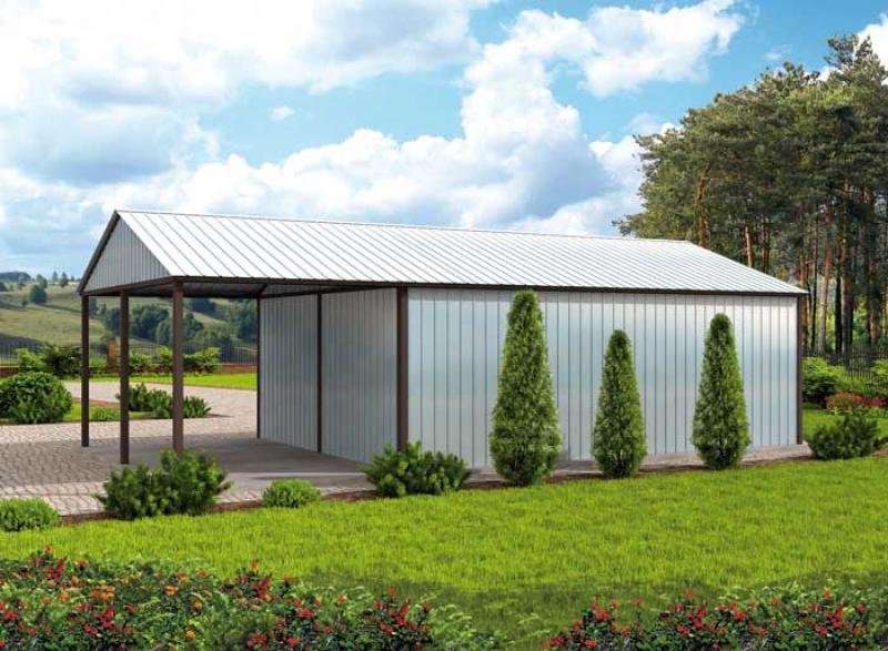 Budynek gospodarczy, wolnostojący. Projekt składa się z części architektonicznej, konstrukcyjnej i wewnętrznej instalacji elektrycznej. W projekcie załączone są podstawowe zestawienie stali, drewna i stolarki okienno-drzwiowej. Do projektu dołączamy bezpłatną zgodę na wprowadzenie zmian, oświadczenie projektantów o wykonaniu projektu zgodnie z obowiązującymi normami i przepisami oraz kserokopie uprawnień projektantów wraz z aktualnym wpisem do izby. W przypadku zamówienia projektu w technologii lekkiej, drewnianej konstrukcji szkieletowej, powierzchnia użytkowa budynku jest o około 7% większa.