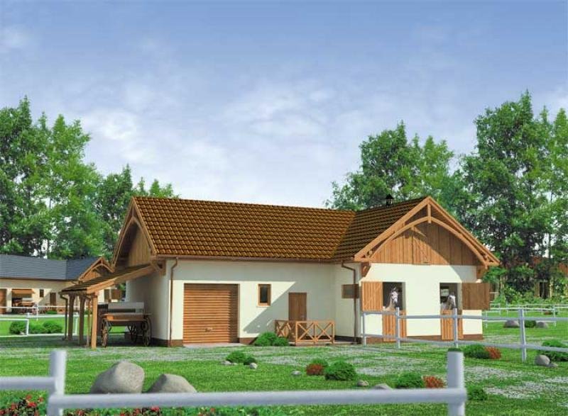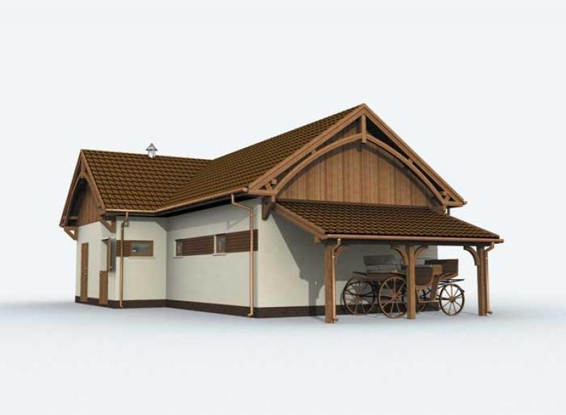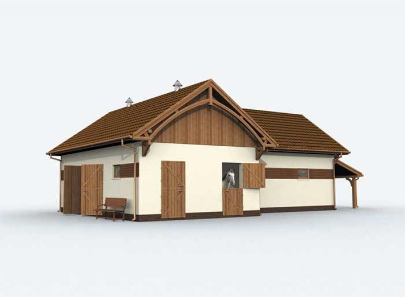 Urocza propozycja stajni z wejściem od strony południowej otoczonym niewielkim gankiem do siodlarni, z której można przejść do łazienki lub komunikacji. Komunikacja łączy ze sobą także boksy dla koni i paszalnię. Każdy z przestronnych boksów posiada dwa wygodne wyjścia – jedno do przestronnej komunikacji i drugie – bezpośrednio na zewnątrz. Zwierzęta będą tutaj miały wszystko to, czego potrzebują do godnego życia – przestrzeń, dostęp do poideł i światła dziennego, gdyż każdy z czterech boksów posiada własne okno. Uzupełnieniem budynku, świadczącym o jego wyjątkowej funkcjonalności, jest jednostanowiskowy garaż z wjazdem także od strony południowej. W tym pomieszczeniu nie zabraknie także miejsca na urządzenie warsztatu. Całość uzupełnia niewielka wiata usytuowana z zachodniego boku domu. Może ten projekt okaże się dla Ciebie idealnym rozwiązaniem?