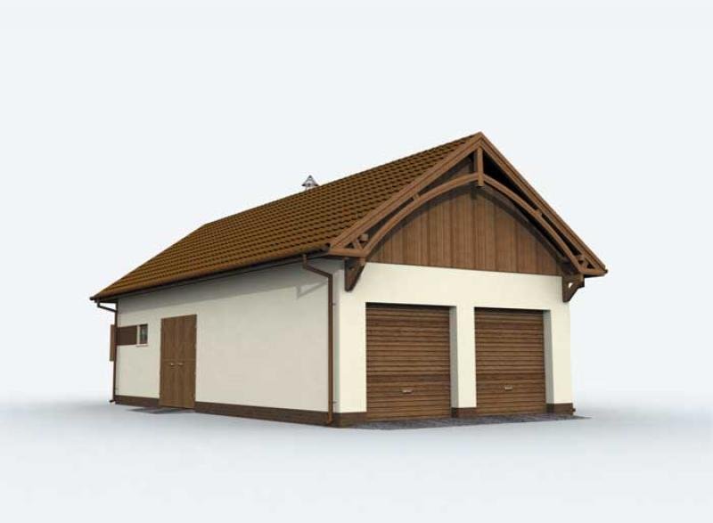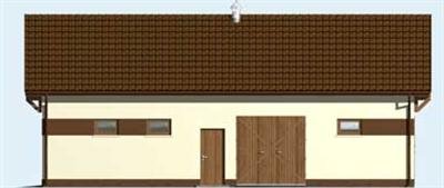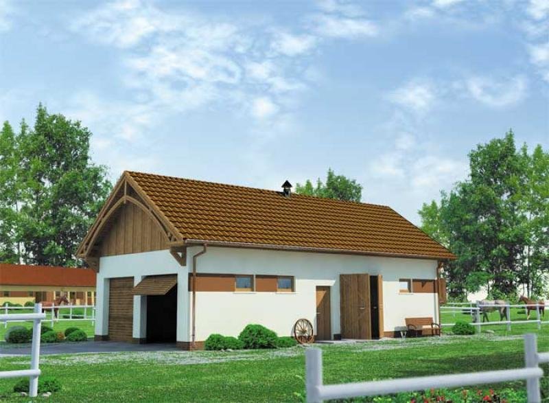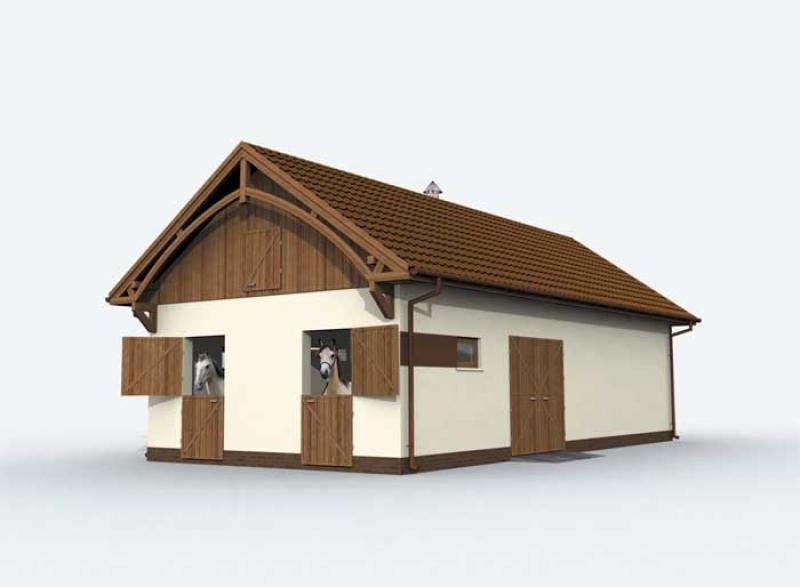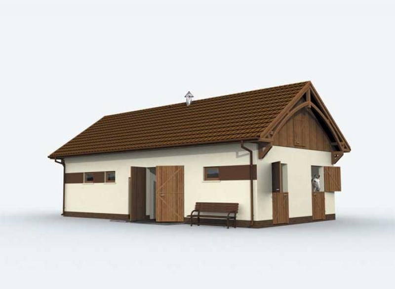 Prosta bryła budynku, a zarazem funkcjonalne wnętrze, to cechy charakterystyczne tego projektu. Stanowi on idealne połączenie stajni dla dwóch koni i dwustanowiskowego garażu. Nie ma tutaj jednak odrębnych pomieszczeń na paszę czy siodła, nie ma łazienki. Tego typu stajnia musiałaby zatem powstać w miejscu, gdzie będzie istniało odpowiednie zaplecze sanitarne. Boksy zostały usytuowane przy wschodniej ścianie budynku. Każdy z nich posiada dwa wyjścia – jedno bezpośrednio na zewnątrz, drugie – do komunikacji wychodzącej na północ i południe budynku. Przy zachodniej jego ścianie przewidziano dwa odrębne wjazdy dla samochodów. Mamy tu przestronny, dwustanowiskowy garaż z dodatkową przestrzenią na warsztat i z dodatkowym wejściem od południa. Czy ten projekt zaspokoi wszystkie Twoje potrzeby i oczekiwania?