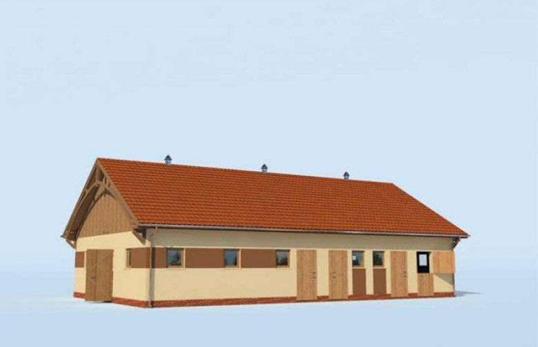 Projekt tej stajni został przewidziany dla osób, które o hodowli koni lub wynajmie stajni myślą na poważnie. Mamy tutaj aż dziewięć boksów o powierzchni 12m2. Jeden z boksów został odseparowany od pozostałych i stanowi izolatkę dla zwierząt. Wszystkie boksy posiadają jednakże dwa wyjścia – jedno bezpośrednio na zewnątrz, drugie – do idącej przez środek komunikacji. Po każdej stronie budynku umieszczono po cztery boksy. Dodatkowy, dziewiąty, został umieszczony przy zachodniej ścianie budynku, obok paszalni. Naprzeciwko tych dwóch pomieszczeń przewidziano otwartą myjnię oraz wejście do siodlarni, z której przechodzi się do łazienki. Ten budynek został tak zaprojektowany z myślą o osobach, które chcą rozwijać hodowlę koni do pewnych rozmiarów. Czy będziesz należał do ich grona?