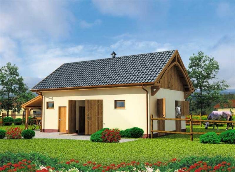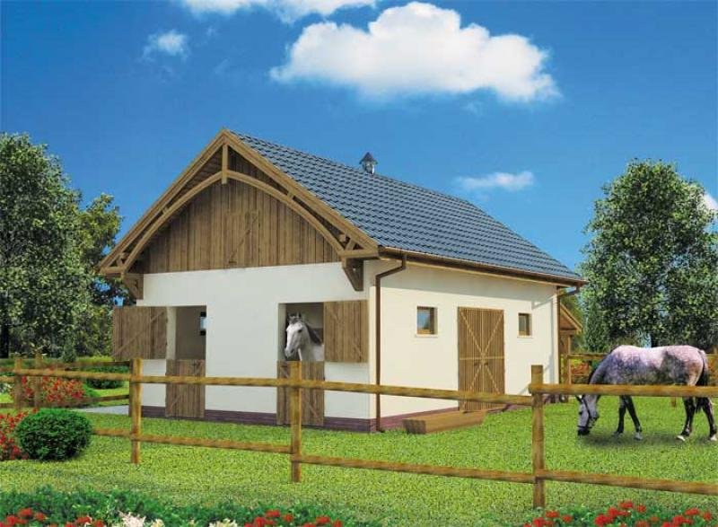 Stajnia S2 została stworzona po to, by stanowić wygodne rozwiązanie dla osób pragnących posiadać własne konie. Nie jest jednak dobrym pomysłem dla tych z Państwa, którzy chcą zakładać hodowlę. Wewnątrz budynku zaprojektowano bowiem dwa boksy o powierzchni 10,5 m2 (wymiar odpowiedni dla wszystkich gatunków koni), przestronną komunikację, osobne pomieszczenia na paszę i siodła oraz łazienkę. Tego typu obiekt może powstać zarówno przy domu właścicieli, jak i jako samodzielny, wolnostojący budynek. Jego niewątpliwym atutem, jest możliwość wyprowadzenia koni na zewnątrz prosto z boksu, jak i przez komunikację wewnątrz budynku stajennego. Dodatkowo z lewej strony przewidziano wiatę, którą można wykorzystać zgodnie z własnymi potrzebami, szczególnie przy niesprzyjającej aurze.