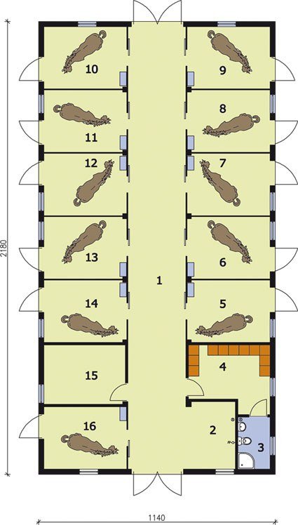 Nieskomplikowany, a dzięki temu przestrzenny projekt stajni dla dziesięciu lub jedenastu koni. Prosta bryła budynku i dwuspadowy dach tworzą niepowtarzalną całość. Po pięć boksów o powierzchni 12 m2 zostało rozmieszczonych zarówno przy wschodniej, jak i zachodniej ścianie budynku. Dodatkowy boks, stanowiący izolatkę, mamy przy zachodniej ścianie budynku, tuż za paszalnią. Przez środek przechodzi obszerna komunikacja zakończona od południa i północy obszernym wyjściem dla zwierząt. Przebywające w tej stajni konie, mogą także wychodzić bezpośrednio z boksów. Przy wejściu od południa urządzono myjnię dla koni, obok której znajduje się wejście do siodlarni. Stąd można też przejść do łazienki. Projekt S20 jest bardzo zbliżony do projektu S19, ale posiada więcej boksów. Być może właśnie ta stajnia okaże się dla Ciebie idealnym rozwiązaniem?
