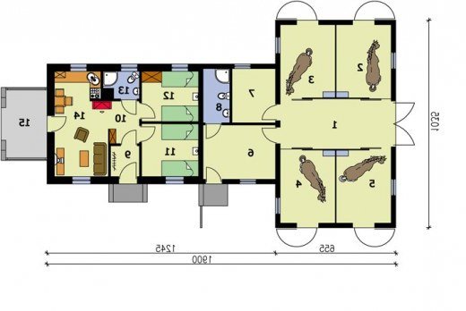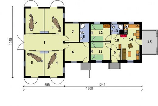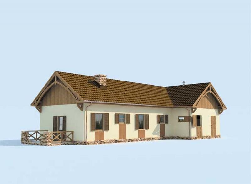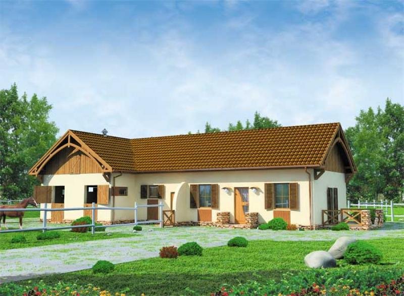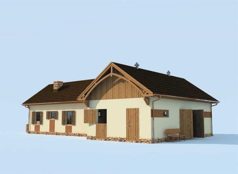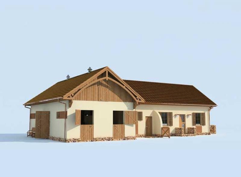 Ten, z pozoru niewielki budynek, łączy w sobie zalety stajni i mieszkania. Ze względu na pełnione funkcje możemy go podzielić na dwie zasadnicze części. Część wschodnia została stworzona z myślą o ludziach. Wejście od południa prowadzi przez wiatrołap do komunikacji, łączącej pokój dzienny z aneksem kuchennym, dwa niezależne pokoje i łazienkę. Z pokoju dziennego można dodatkowo przejść na niewielki, ale dający wytchnienie w letnie dni taras. Może tu mieszkać od dwóch do czterech osób. Część zachodnia natomiast została w pełni poświęcona koniom. Obszerne wejście od zachodu prowadzi do szerokiej komunikacji łączącej cztery boksy. Każdy z nich posiada dodatkowe, osobne wyjście bezpośrednio na zewnątrz. Z tej komunikacji można także przejść do paszalni. W części środkowej budynku, posiadającej osobne, dodatkowe wejście, przewidziano siodlarnię z osobną łazienką. Ten projekt z pewnością należy do dobrze przemyślanych rozwiązań. Zapytaj siebie, czy w pełni zaspokoi Twoje potrzeby? Czy chcesz się skupić po prostu na posiadaniu koni i nie myślisz o rozwijaniu hodowli? Czy warto wziąć pod uwagę właśnie ten projekt?