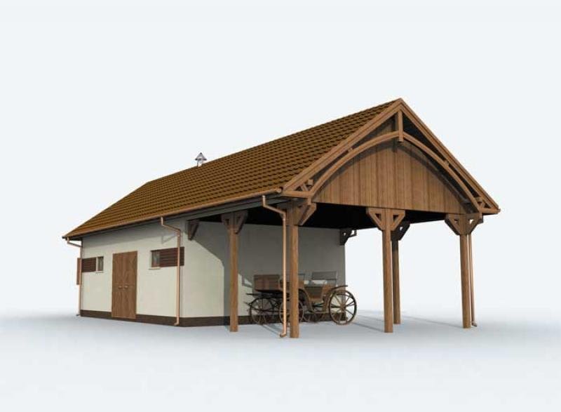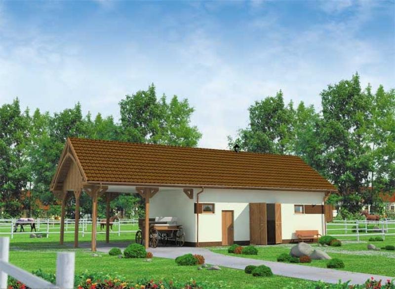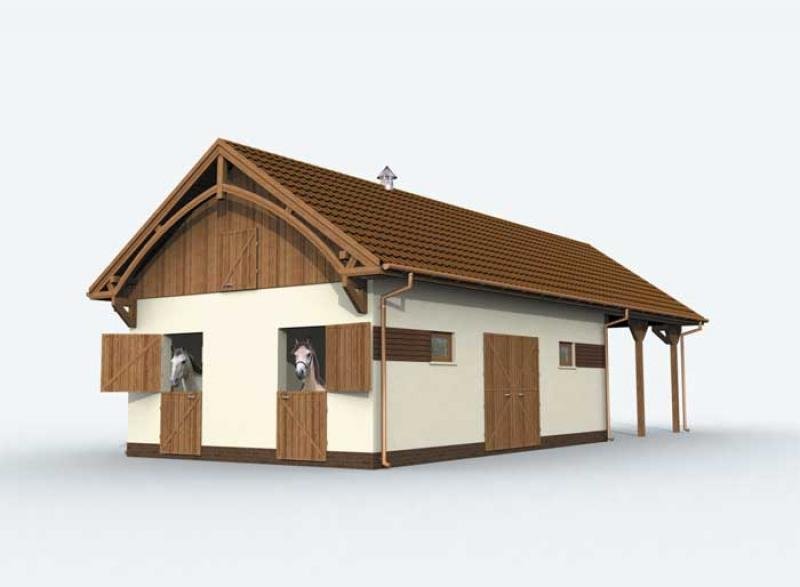 Stajnia S03 to ciekawa propozycja dla osób, które chcą własną stajnię, ale nie chcą jej szczególnie rozwijać. Ten obiekt został przewidziany dla dwóch koni, oba boksy mają powierzchnię 10,5 m2. Zwierzęta można wyprowadzać zarówno poprzez komunikację wewnątrz budynku, jak i prosto z boksów. Będzie to szczególnie wygodne rozwiązanie, jeżeli przygotuje się dla nich w tym miejscu odpowiedni wybieg. Ponadto w budynku przewidziano także obszerną paszalnię, siodlarnię oraz łazienkę z przepływowym, umywalkowo – natryskowym ogrzewaczem wody. Na uwagę zasługuje również przestronna wiata z lewej strony budynku. Okaże się ona bardzo pożyteczna przy każdych warunkach pogodowych (może ochronić przed deszczem, słońcem itp., można tutaj zostawić samochód). Czy ta stajnia będzie dla Ciebie wystarczająca? Czy okaże się wygodnym rozwiązaniem za kilka lub kilkanaście lat? Warto odpowiedzieć sobie na pytania już dzisiaj, by później nie żałować chybionej inwestycji.