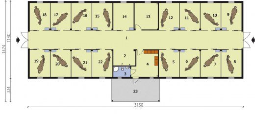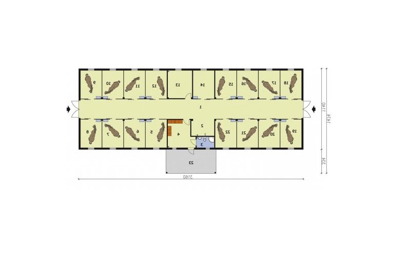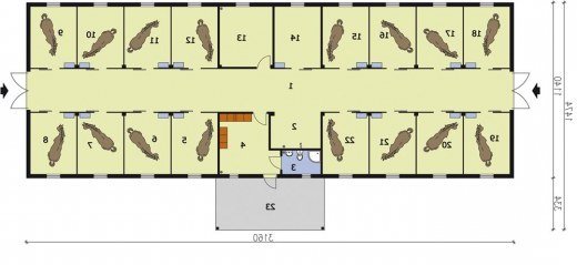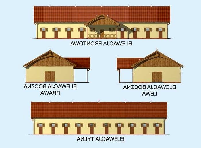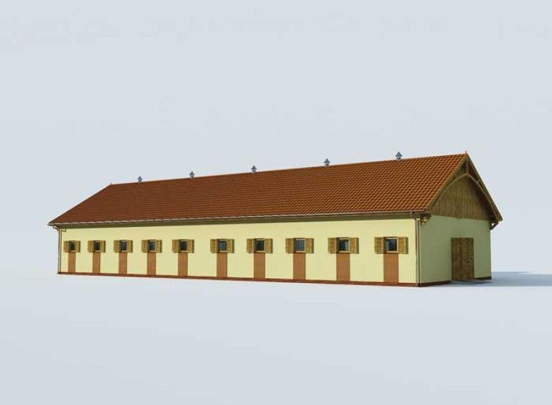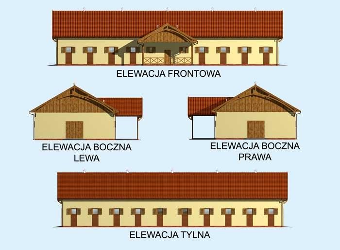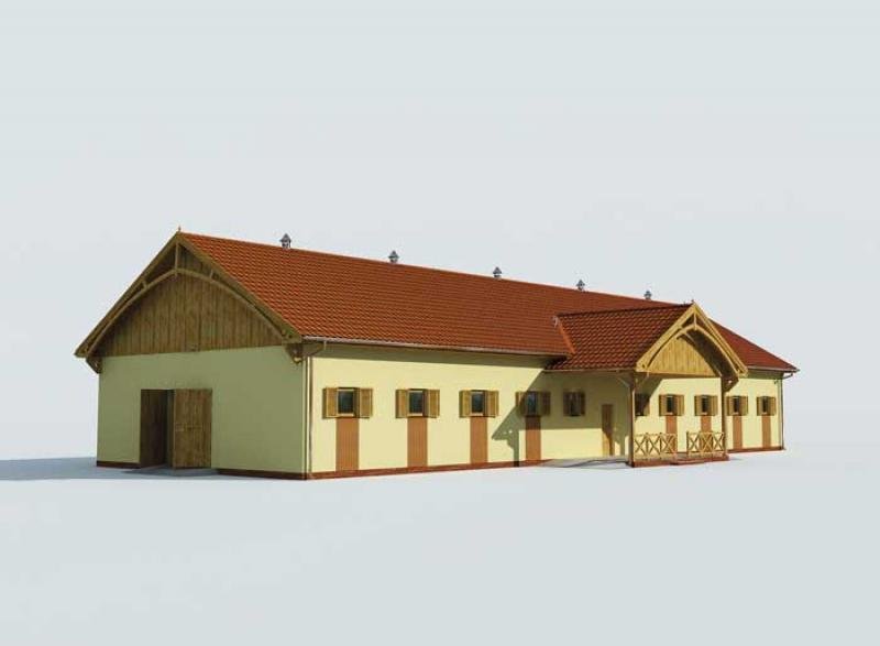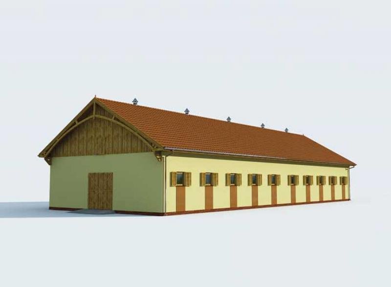 Projekt stajni dla koni - 16 boksów Niemałych rozmiarów stajnia to propozycja dla średnich stadnin. Przedzielająca stajnię komunikacja wyznacza drogę do wszystkich 16 boksów. Siodlarnia, paszalnia, izolatka dla konia oraz łazienka to pomieszczenia, dzięki którym będzie można bezpiecznie, w czystości i porządku prowadzić hodowlę zwierząt. Gustowne jętki oraz odeskowanie widoczne od południa, zachodu i wschodu sprawiają, że s33 łączy w sobie piękno funkcjonalności i estetyki. Każdy koń w swoim boksie ma dostęp do okna. Warto zauważyć, że oprócz wymiaru humanitarnego okna poprawiają także wentylację stajni. Projekt stajni składa się z czterech egzemplarzy a w tym części architektonicznej, konstrukcyjnej i instalacji wewnętrznej elektrycznej. W projekcie załączone są podstawowe zestawienie stali, drewna i stolarki okienno-drzwiowej. Do projektu dołączamy bezpłatną zgodę na wprowadzenie zmian, oświadczenie projektantów o wykonaniu projektu zgodnie z obowiązującymi normami i przepisami oraz kserokopie uprawnień projektantów wraz z aktualnym wpisem do izby