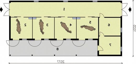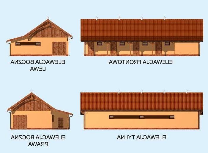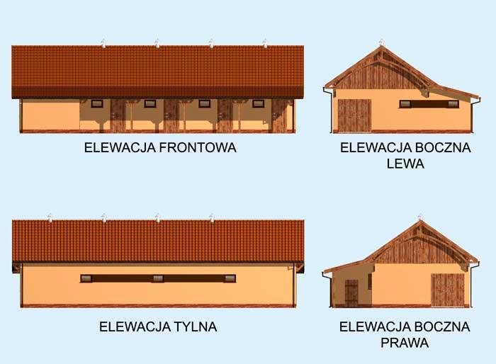 Długa komunikacja wewnątrz budynku oraz odpowiadająca jej wiata biegną wzdłuż stajni i prowadzą do czterech, przestronnych boksów przeznaczonych dla koni. W tym gustownym i praktycznym budynku znajdziemy również paszalnię i siodlarnię. Stajnia z pewnością sprawdzi się w przydomowej hodowli koni. Projekt stajni składa się z czterech egzemplarzy a w tym części architektonicznej, konstrukcyjnej i instalacji wewnętrznej elektrycznej. W projekcie załączone są podstawowe zestawienie stali, drewna i stolarki okienno-drzwiowej. Do projektu dołączamy bezpłatną zgodę na wprowadzenie zmian, oświadczenie projektantów o wykonaniu projektu zgodnie z obowiązującymi normami i przepisami oraz kserokopie uprawnień projektantów wraz z aktualnym wpisem do izby