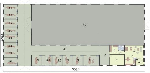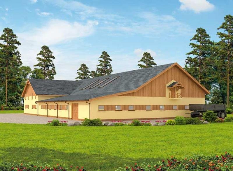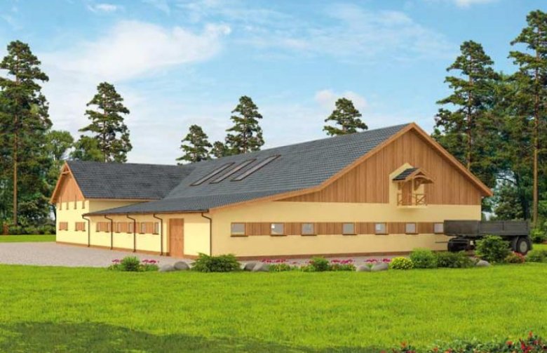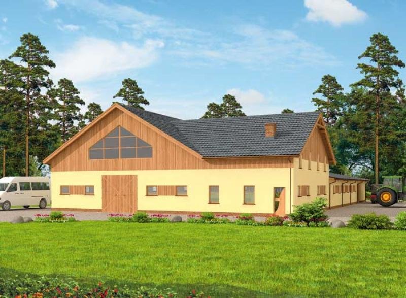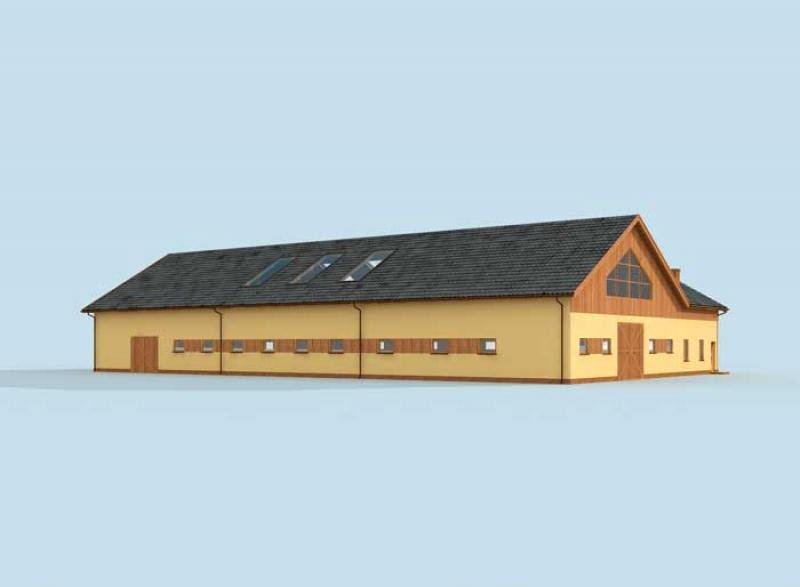 Stajnia na 13 boksów, z częścią mieszkalną, ujeżdżalnią . Ten blisko 1200 metrowy budynek stajni imponuje rozmachem z jakim został zaprojektowany. Duża ujeżdżalnia, czyli pomieszczenie przeznaczone do nauki jazdy konnej przez cztery pory roku. Można ją pokryć sypkim piaskiem. Ujeżdżalnia może służyć jako miejsce pokazów, konkursów i zawodów sportowych. Część mieszkalna oraz 13 boksów + 1 dla klaczy ze źrebięciem tworzy przemyślaną całość, zapewniającą zwierzętom, właścicielom i obsłudze odpowiednie warunki do pracy i opieki. Komunikacja na przestrzał wraz z częścią skierowaną na południowy-wschód umożliwia szybkie i bezpieczne prowadzenie hodowli. Zarówno sprzątanie boksów, jak i karmienie nie sprawiają większych trudności. Boksy o wymiarach niespełna 12 m2 są komfortowe, wyposażone w otwory okienne, zapewniające odpowiednią wentylację. Część mieszkalna usytuowana jest od południowo-zachodniej strony. Wiatrołap, kuchnia z aneksem-jadalnym i salon tworzą jedno pomieszczenie i to w nim usytuowane są schody wiodące na piętro. Dalej znajdziemy przedsionek, po lewej łazienkę zaś na wprost siodlarnię, z której można przejść do części stajennej i paszarni. Na piętrze części mieszkalnej znajdą Państwo dwie łazienki, trzy sypialnie oraz dwa pokoje.