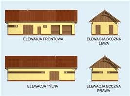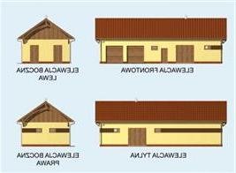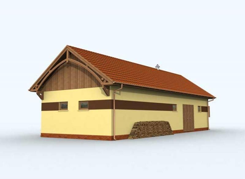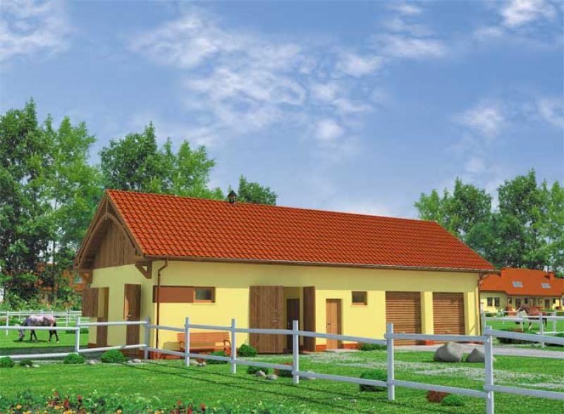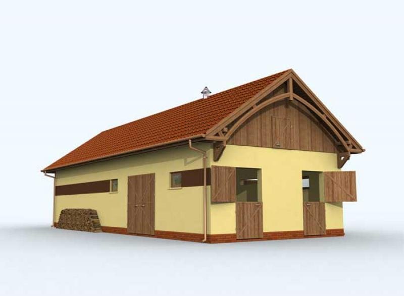 Niezwykle funkcjonalny projekt łączący w sobie zalety stajni i garażu. Miejsce dla koni zostało przewidziane z lewej strony budynku. Zwierzęta mogą wyjść na zewnątrz bezpośrednio z boksów, jak i komunikacją wewnątrz budynku. Bezpośrednio z komunikacji można także przejść do paszalni lub siodlarni, w której znajduje się wejście do łazienki zaopatrzonej w kabinę prysznicową. Drugą, wyodrębnioną część budynku stanowi obszerny garaż przeznaczony na dwa samochody, z miejscem na urządzenie warsztatu. Ten projekt będzie zatem przeznaczony dla osób pragnących posiadać dwustanowiskowy garaż połączony z dwoma boksami dla koni. Budynek będzie odpowiednim uzupełnieniem dla wygodnego domu.
