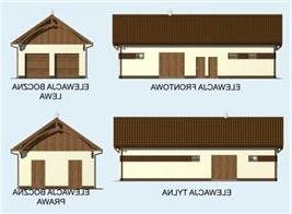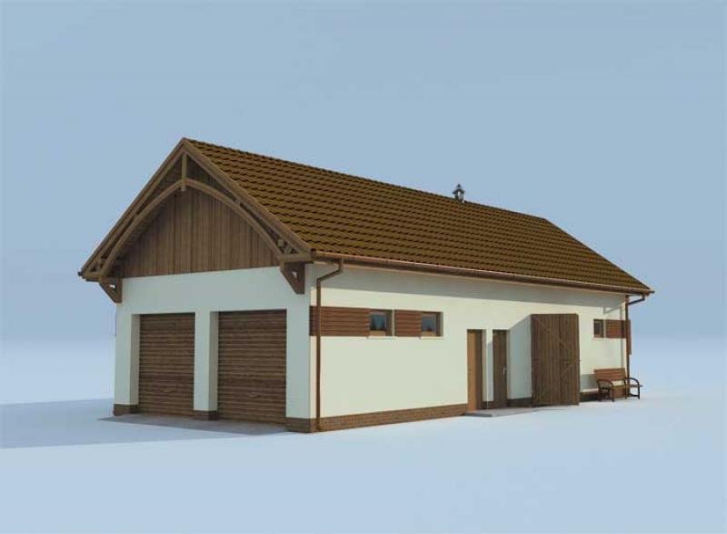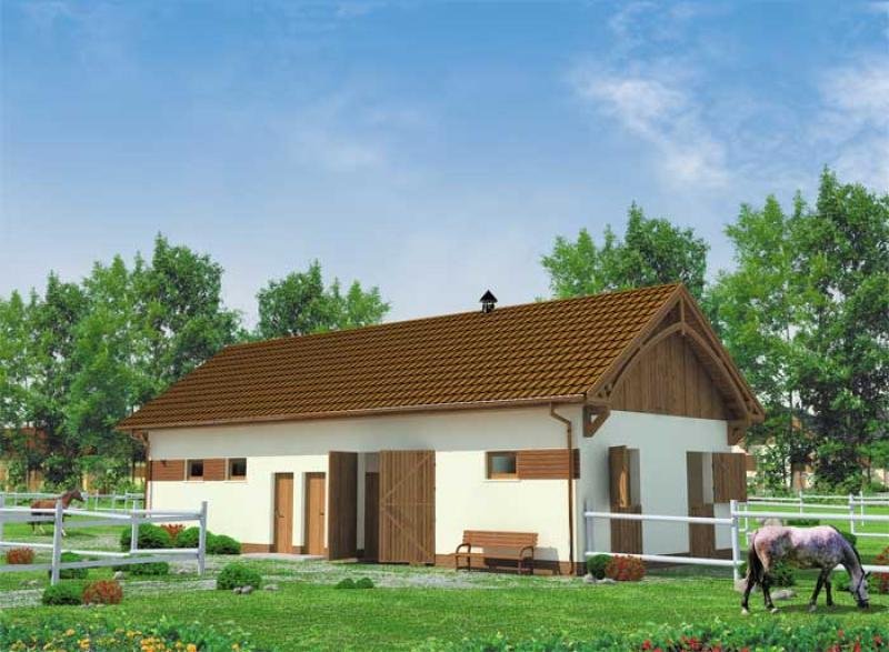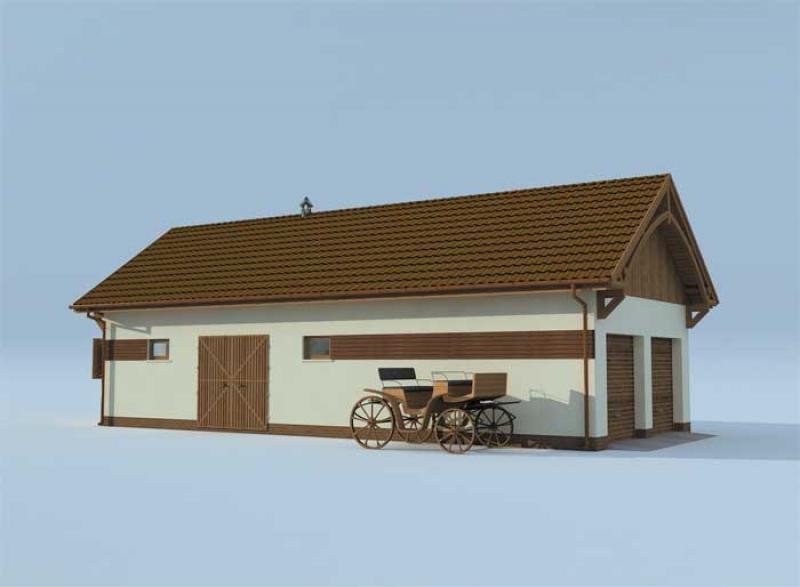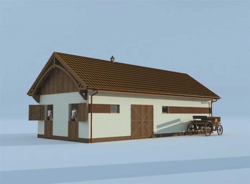 Ciekawe ustawienie wszystkich wejść do tego budynku, okaże się zapewne korzystnym rozwiązaniem w niektórych przypadkach. W projekcie tym przewidziano dwustanowiskowy garaż z drzwiami wjazdowymi zorientowanymi na zachód oraz dwa boksy dla koni usytuowane po wschodniej stronie budynku. Zwierzęta przebywające w boksach, mogą z nich wyjść korytarzem znajdującym się wewnątrz budynku stajennego, jak i bezpośrednio z boksów. Wewnątrz budynku przewidziano także siodlarnię i paszarnię. Garaż został oddzielony od pomieszczeń przeznaczonych dla koni, ale do obu części prowadzą dodatkowe drzwi przewidziane na ścianie południowej. Taki budynek będzie niezwykle funkcjonalny, jeżeli zostanie odpowiednio wkomponowany w otoczenie.