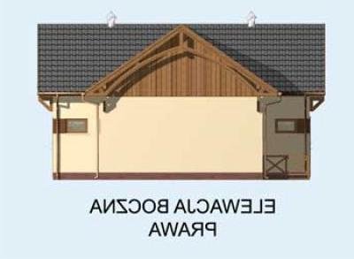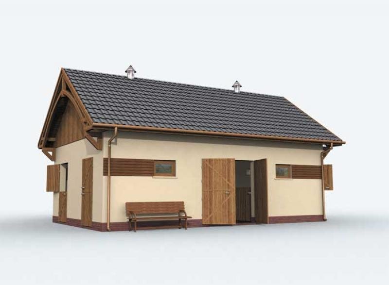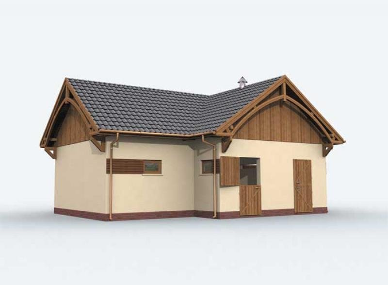 Ten projekt stajni okaże się świetnym rozwiązaniem dla osób, myślących o nieco rozbudowanej hodowli koni. Mamy tu bowiem cztery wygodne boksy (jednak zbyt małe dla dużej, mającej się oźrebić klaczy), z których zwierzęta mogą bezpośrednio wyjść na zewnątrz budynku. Ponadto wszystkie boksy zostały połączone obszerną komunikacją, z której wyjście znajduje się z lewej strony budynku. W drugiej części budynku, stanowiącej swoisty wykusz przewidziano paszalnię, do której wchodzi się wprost z komunikacji przeznaczonej dla zwierząt oraz siodlarnię z dostępem do łazienki. Siodlarnia została zaopatrzona w dodatkowe wyjście na zewnątrz otoczone niewielkim ganeczkiem. Jeżeli myślisz o posiadaniu czterech koni, to ten projekt będzie dla Ciebie z pewnością wygodnym rozwiązaniem!