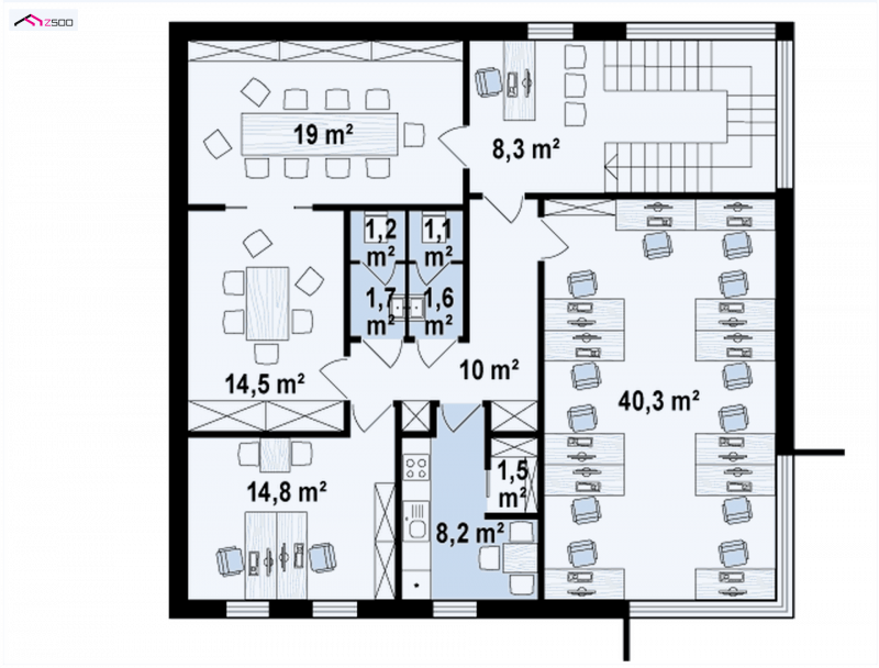 Budynek został zaprojektowany w taki sposób, że od strony frontowej mamy wejście do lokalu usługowego, może to być sklep, fryzjer, bądź inny. Z tyłu rozplanowano zaplecze socjalne. Natomiast oddzielne tylne wejście prowadzi do magazynu, sąsiadującymi schodami wspinamy się na górę, gdzie w holu ustawiono stanowisko recepcyjne. Stąd bezpośrednie przejście do sali konferencyjnej i drugie wejście do pomieszczeń biurowych. Open space o powierzchni 40 m2 to powierzchnia doskonale dostosowana dla większej ilości pracowników. Aby o nich należycie zadbać, sąsiaduje z pomieszczeniem socjalnym, w którym można pozostawić odzienie wierzchnie i zaparzyć kawę. Węzeł sanitarny umieszczono w środkowej części piętra, a pokój spotkań nie posiada okien, by niepotrzebnie nie odciągać uwagi petentów.
