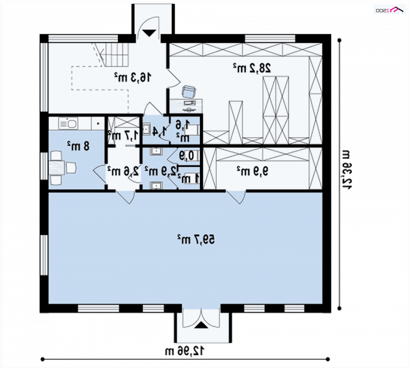 Prezentowany układ pomieszczeń jest przykładowy i wymaga przystosowania do indywidualnych potrzeb i wymagań w zależności od przeznaczenia obiektu. Projekt wymaga adaptacji do usługi.