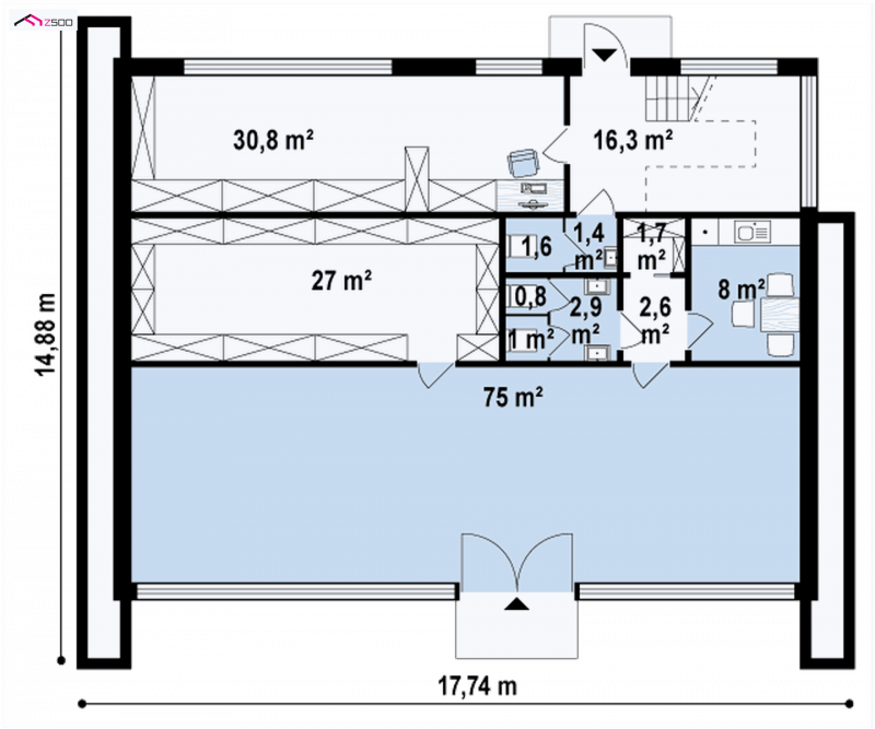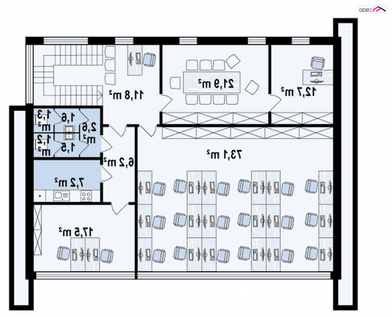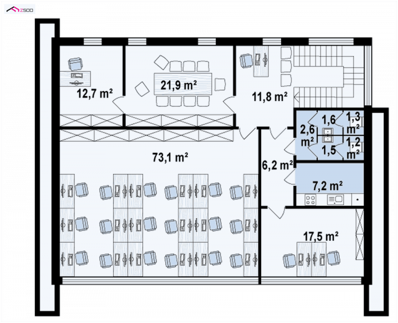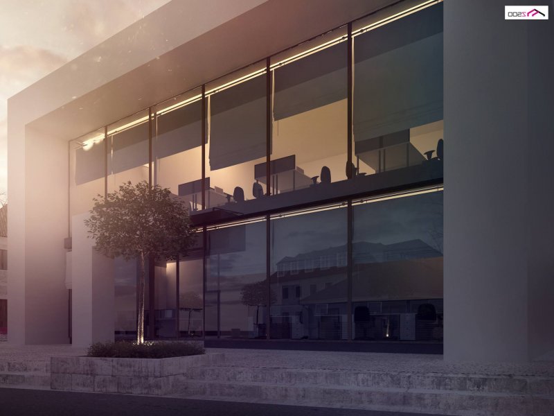 Od strony frontowej mieści się wejście do lokalu usługowego, zaś w tylnej części rozplanowano zaplecze socjalne. Oddzielne tylne wejście prowadzi do magazynu. Sąsiadującymi schodami wspinamy się na górę, gdzie wita nas reprezentacyjnie urządzona recepcja. Stąd 3 przejścia: 1 - do sali konferencyjnej 2 - do open space 3 – do gabinetu, serwerowni lub innego pomieszczenia zaaranżowanego według naszych potrzeb.