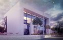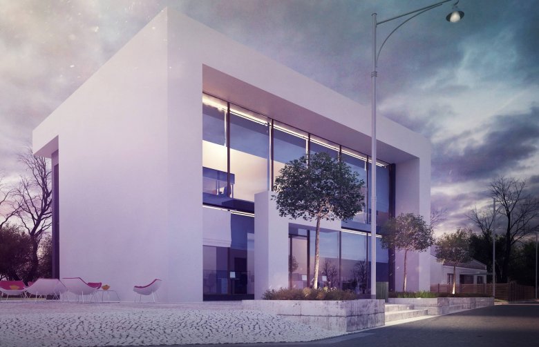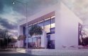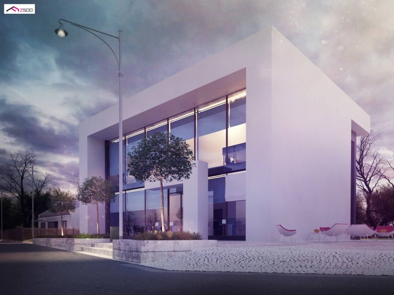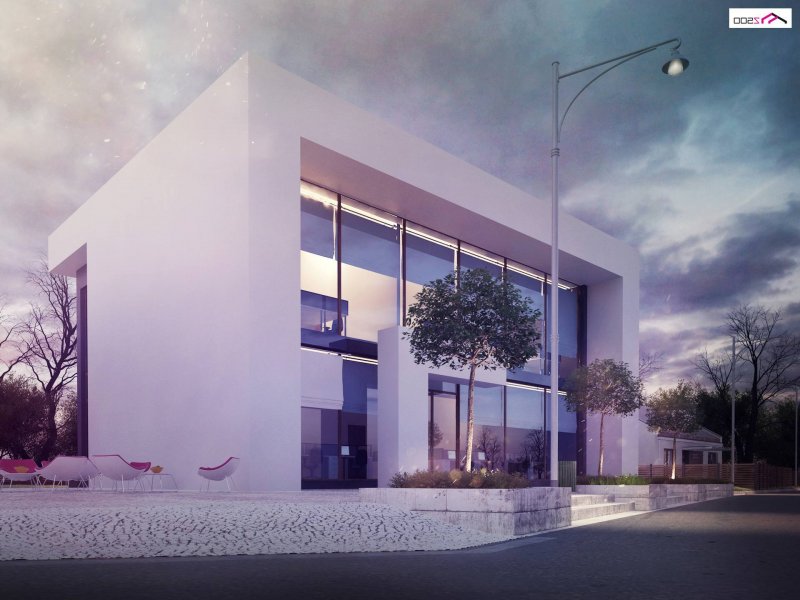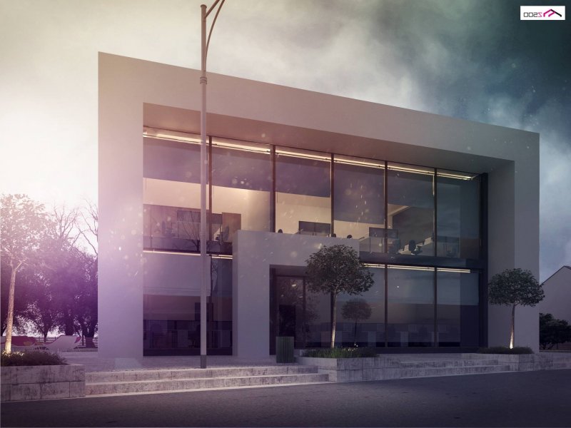Standardowy, nowoczesny dwukondygnacyjny projekt lokalu usługowego z prostszą, bardziej surową bryłą niż w Zu11, bez drewnianych elementów ozdobnych.