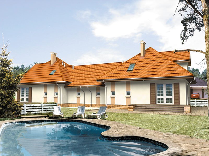 Ściany: 2-warstwowe - pustak ceramiczny + styropian, Stropy: żelbetowe, wylewane, Dach: dachówka, kąt nachylenia 40°