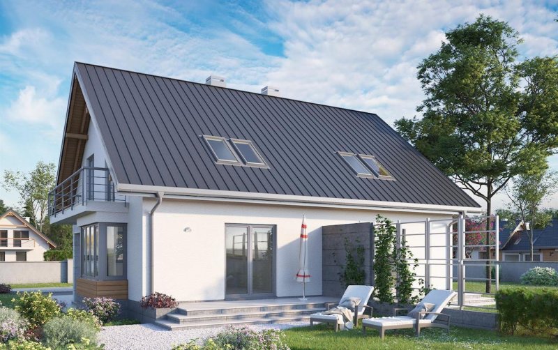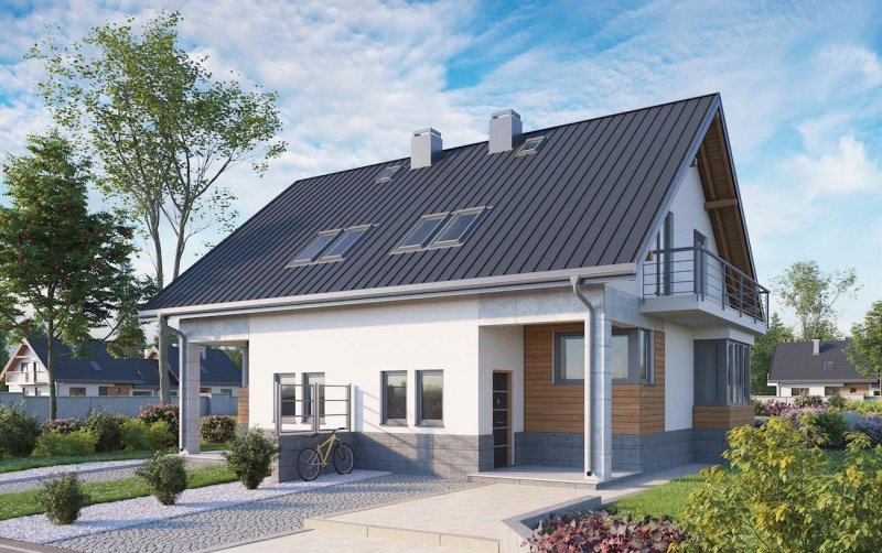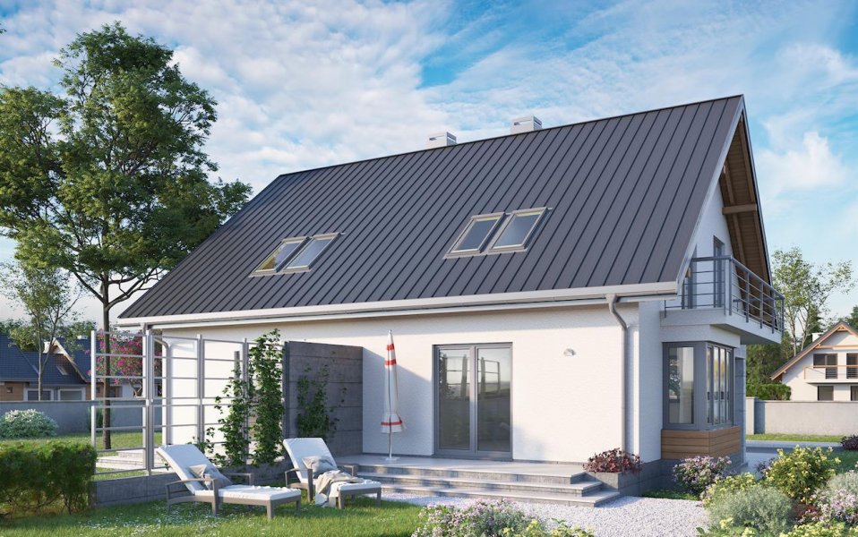 Projekt domu Beza Duo to jedna z najprostszych koncepcji parterowego domu z użytkowym poddaszem przeznaczona do zabudowy bliźniaczej (w granicy działki). Decyduje o tym nie tylko oszczędna powierzchnia i wąski, wydłużony w kierunku prostopadłym do drogi dojazdowej rzut, ale także brak garażu. Miejsce do parkowania przewidziano przed oknami sieni, pozostawiając dostęp do wejścia głównego w podcieniu z wysokim słupem (podobne rozwiązanie ale zabudowane garażem ma Juta Duo). Prosta bryła z ekonomicznym dwuspadowym dachem bez lukarn obejmuje strefę życia rodzinnego z łazienką na parterze oraz trzy sypialnie dla czterech osób i łazienkę na poddaszu. Połączone w jednoprzestrzenne pomieszczenie: salon, kuchnia, hol i schody maksymalnie wykorzystują miejsce tworząc atrakcyjne, nowoczesne wnętrze. Przeszklony ryzalit, niosący balkon w ścianie szczytowej, jest jedynym, obok frontowej wnęki, urozmaiceniem sylwetki Bezy. Różnica poziomów między sienią a głównym poziomem parteru w projekcie domu Beza Duo dobrze wykorzysta niewielki spadek działki w kierunku wjazdu. Elewacja frontowa jest dzięki temu wyższa i nadaje bryle miejski charakter.