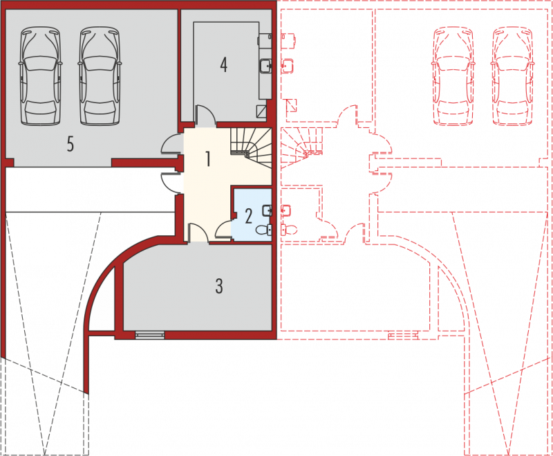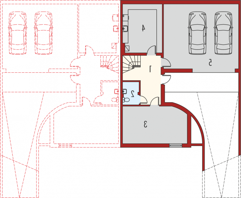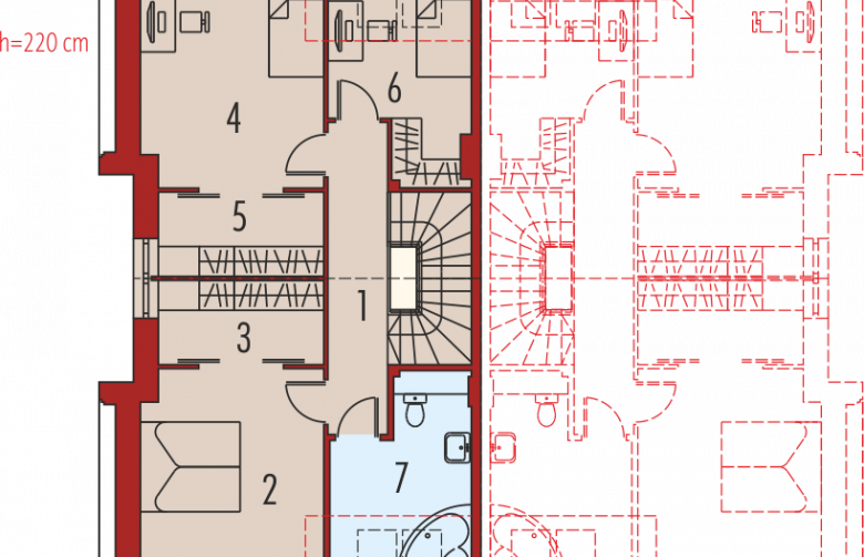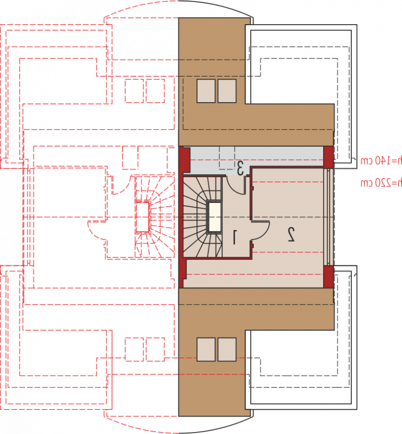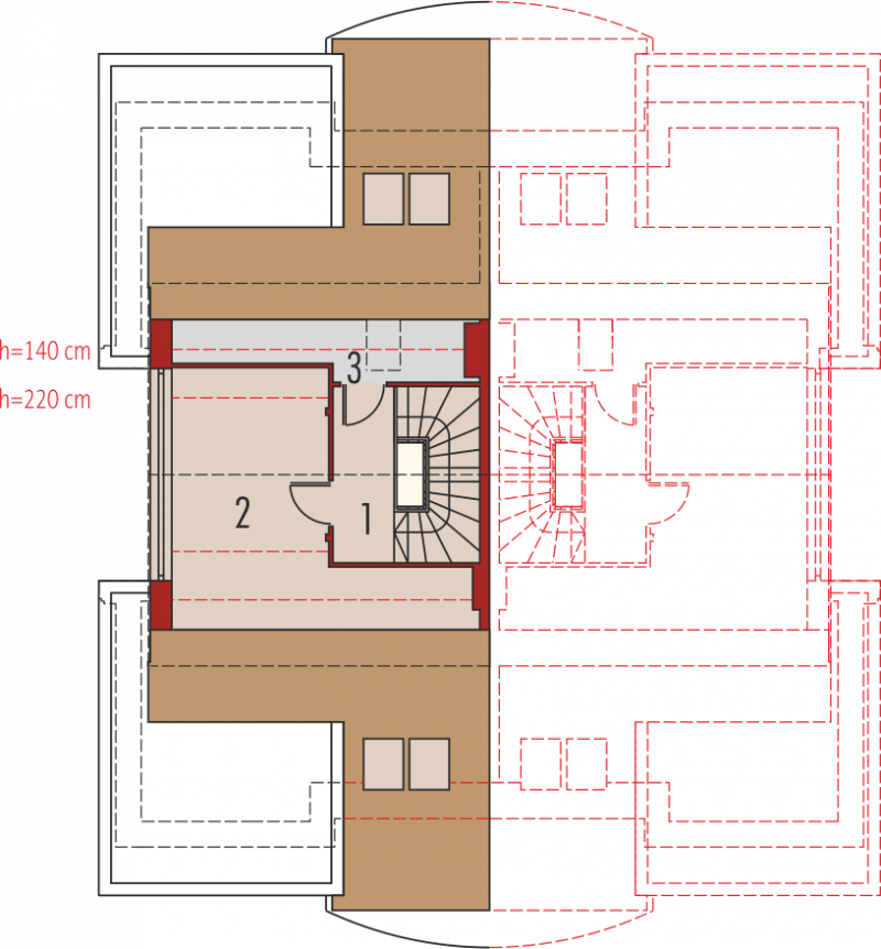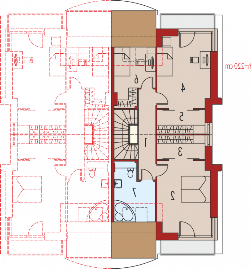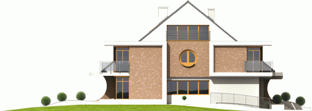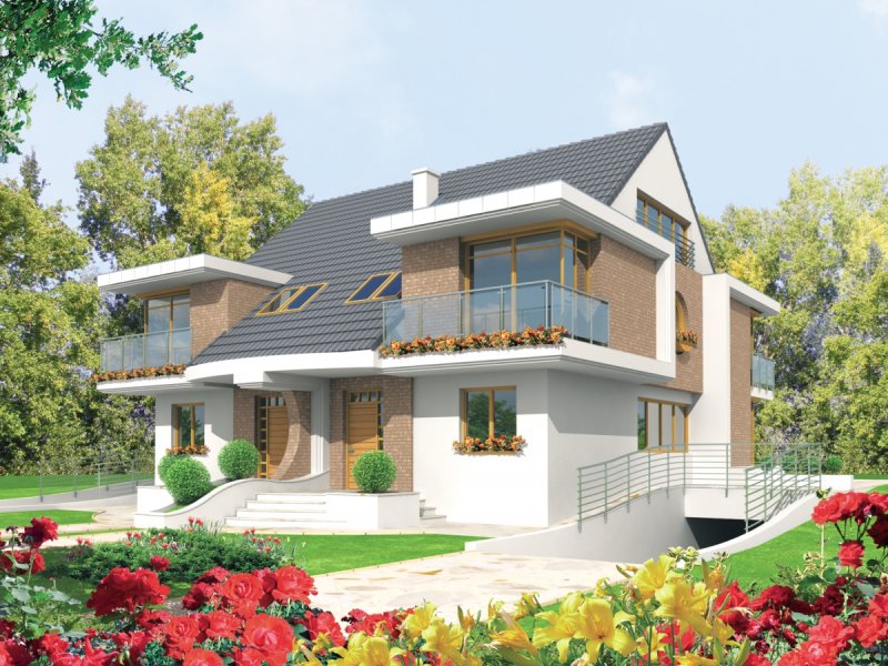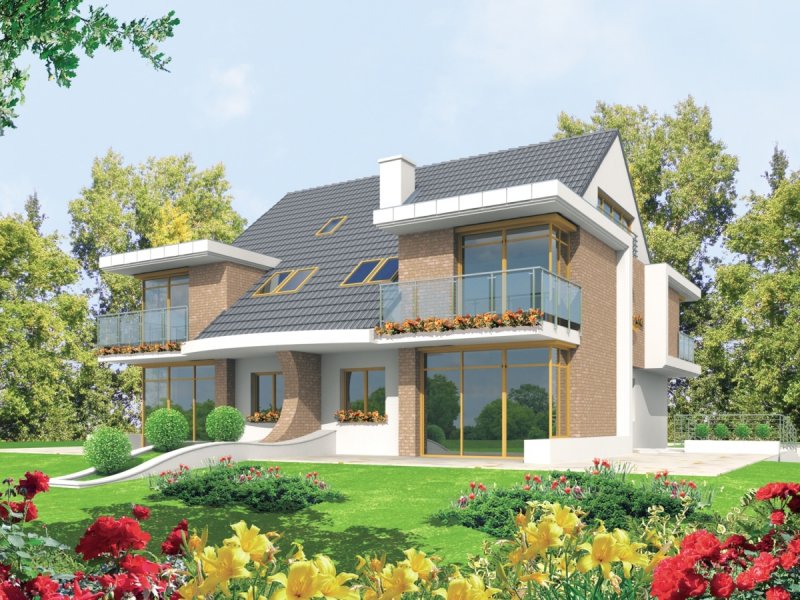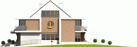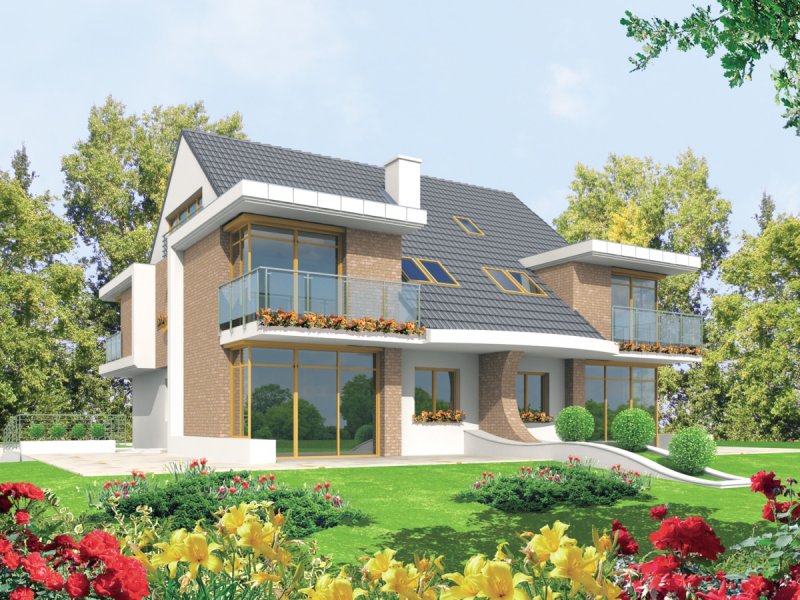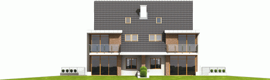 Dom parterowy, z dwupoziomowym poddaszem użytkowym, podpiwniczony, przeznaczony dla 4-5-osobowej rodziny. Projekt jest szczególnie polecany na działki przeznaczone do zabudowy bliźniaczej. Standardowo wydzielono część dzienną na parterze i nocną na poddaszu, na drugim poziomie poddasza znajduje się cześć rekreacyjna oraz strych. Strefa dzienna mieści salon, kuchnię z jadalnią, gabinet oraz łazienkę. Istnieje możliwość otwarcia lub zamknięcia strefy salonu i oddzielenia jej od części kuchennej. Na zaprojektowaną na poddaszu strefę nocną składają się trzy sypialnie, dwie garderoby oraz łazienka.