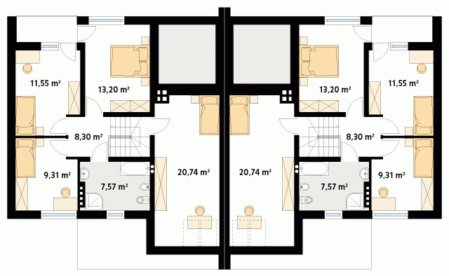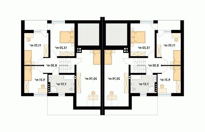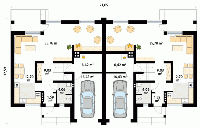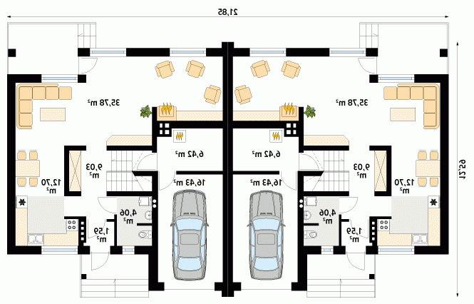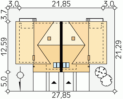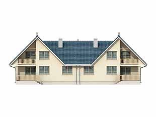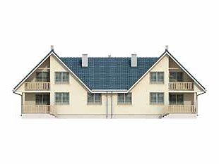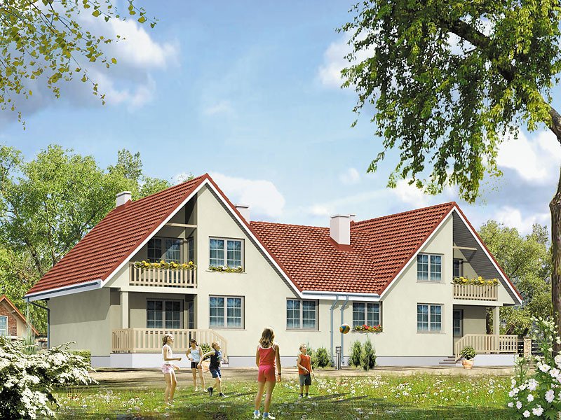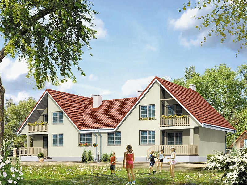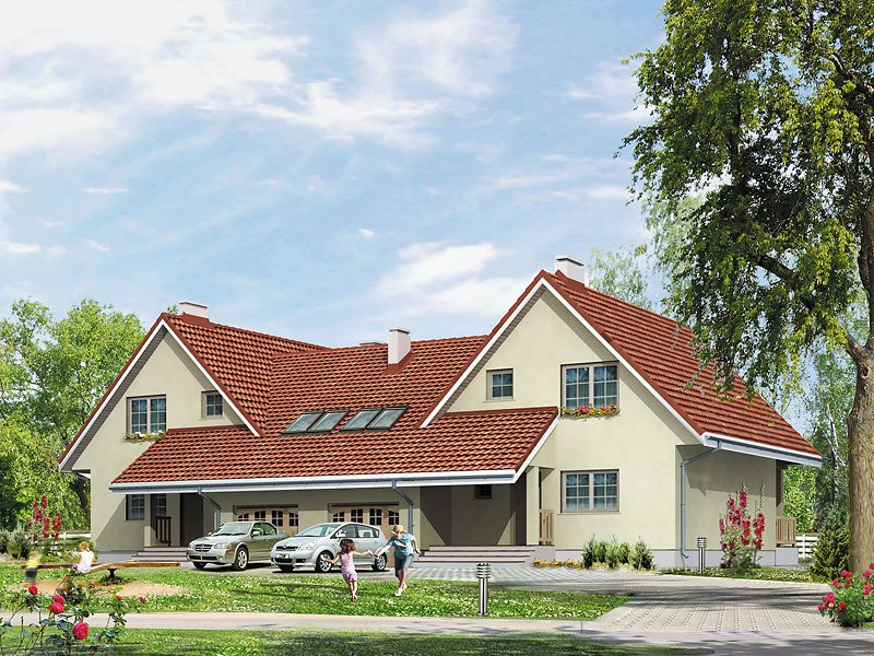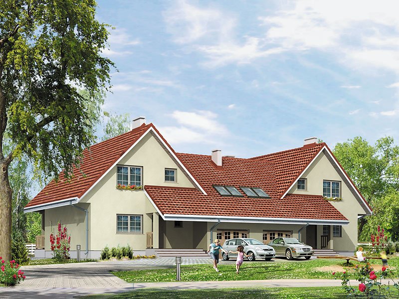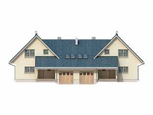 Dom jednorodzinny w zabudowie bliźniaczej, parterowy, niepodpiwniczony z użytkowym poddaszem. Dom dla rodzin 4 – 6-osobowych. Duży pokój dzienny na parterze z możliwością wydzielenia dodatkowego pomieszczenia. Nad garażem na półpiętrze niekrępujący pokój lub pomieszczenie hobby.