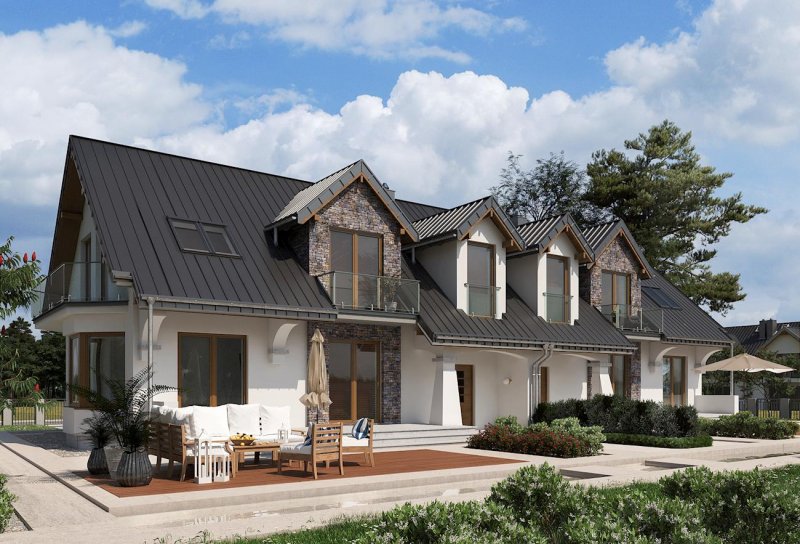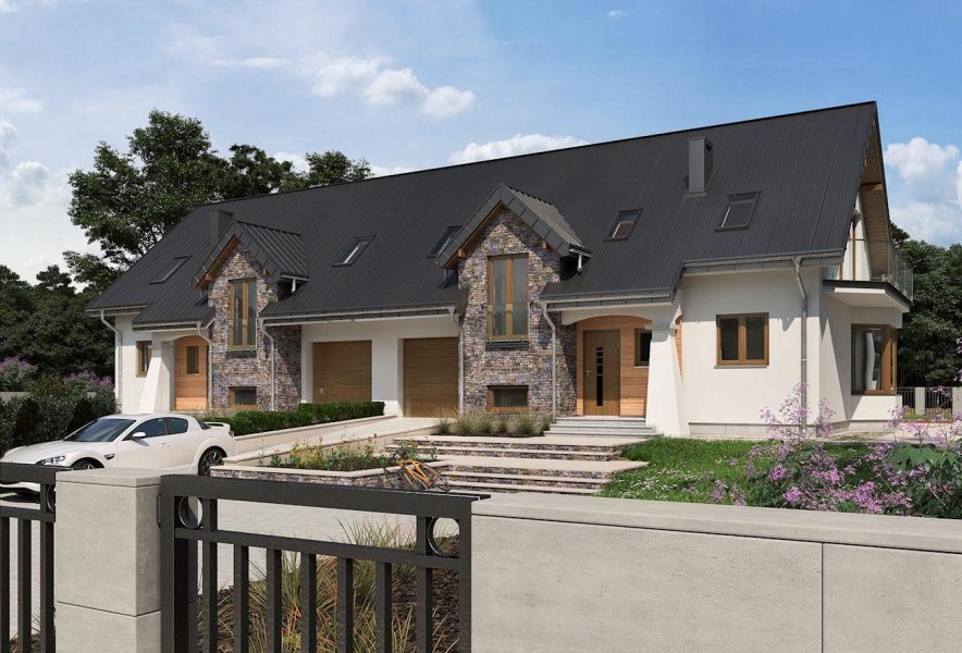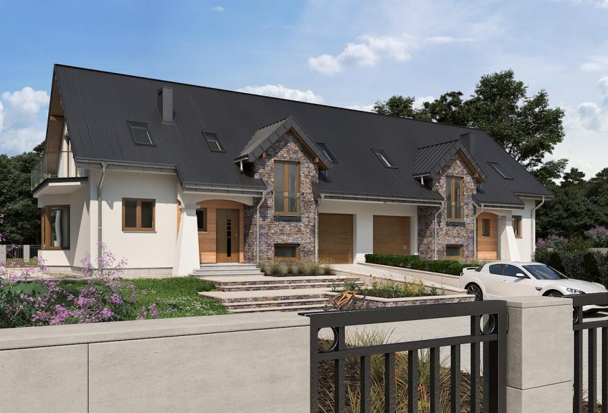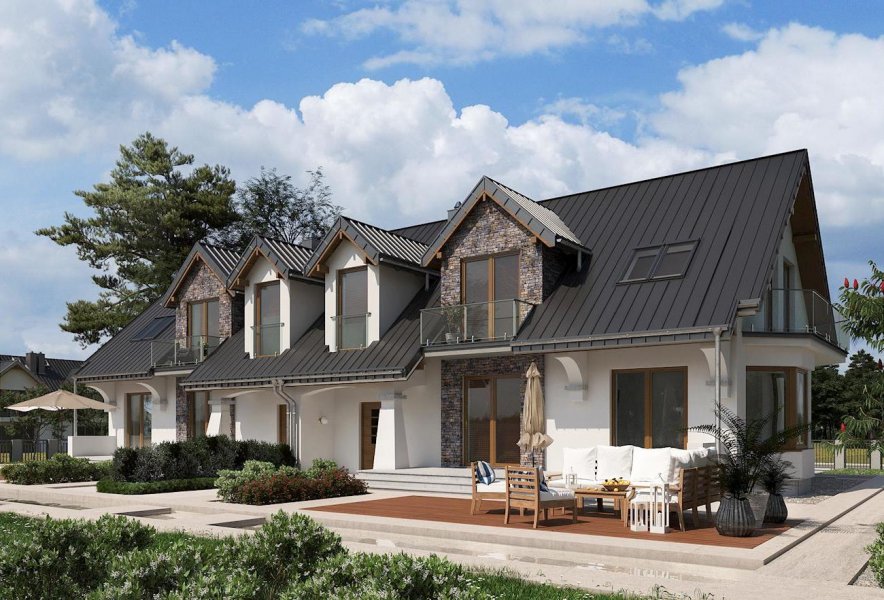 Zabudowa bliźniacza (w granicy działki) najczęściej dotyczy niewielkich parceli w obrębie miast. Projekt parterowego domu z użytkowym poddaszem i wbudowanym garażem Fermata Duo cechuje architektura dostosowana do takich właśnie obszarów. Wspólny dwuspadowy dach z kalenicą równoległą do drogi dojazdowej, przekrywa część mieszkalną i garażową. Wysunięty ryzalit z klatką schodową oraz wejściowy podcień z dekoracyjnym słupem w formie przypory dzielą elewację skierowaną do ulicy. Parter zaprojektowano dość tradycyjnie: ściana nośna wyraźnie separuje kuchnię z frontowym oknem i hol z wc od obszernego, podłużnego salonu z dwoma wyjściami na taras ogrodowy. Na poddaszu są cztery pokoje, w tym główna sypialnia z dużą garderobą, oraz łazienka. Trzy lukarny w dachu, dwa balkony, a jeszcze ryzalit jadalni w ścianie bocznej, razem z detalem frontu, decydują o niezwykłej malowniczości sylwetki Fermaty. Nadając jej charakter kamieniczki sprawiają, że projekt domu Fermata Duo najlepiej sprawdzi się w osiedlach powstających z zamysłem odtworzenia wnętrz i klimatu miejskich uliczek.