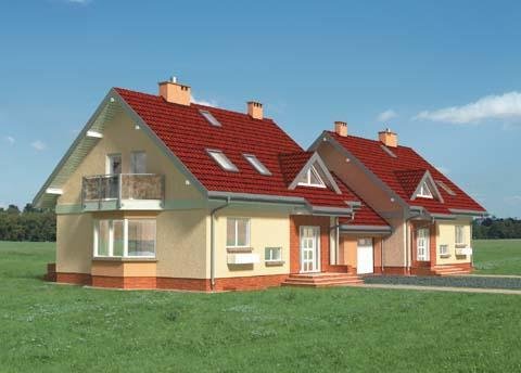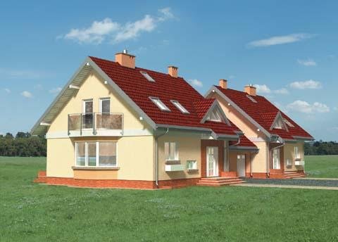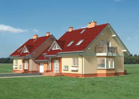 Bryła budynku to prostopadłościan z garażem, nakryty dachem dwuspadowym o kącie nachylenia połaci 40 st. z zaakcentowanym wejściem poprzez podcieniem. Elementem rozrzeźbiajacym obiekt jest lukarna od strony frontowej oraz okna narożne w elewacjach bocznych.