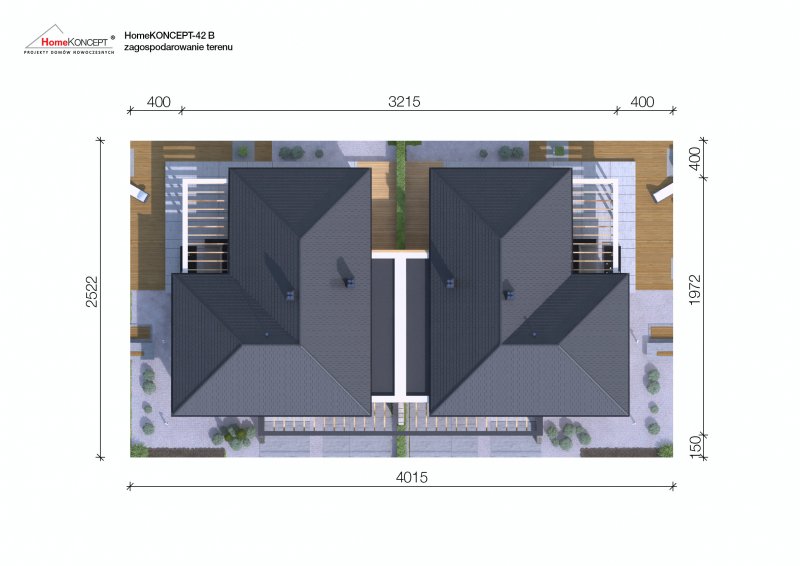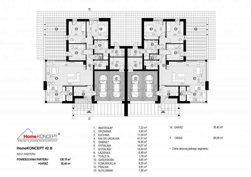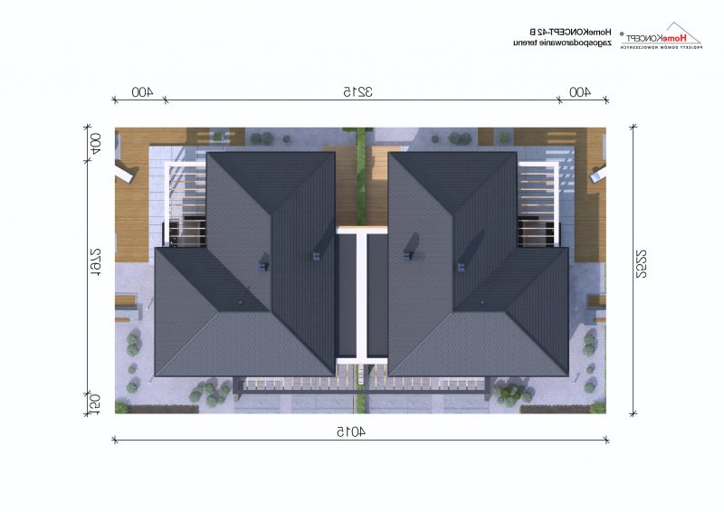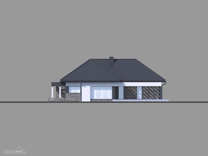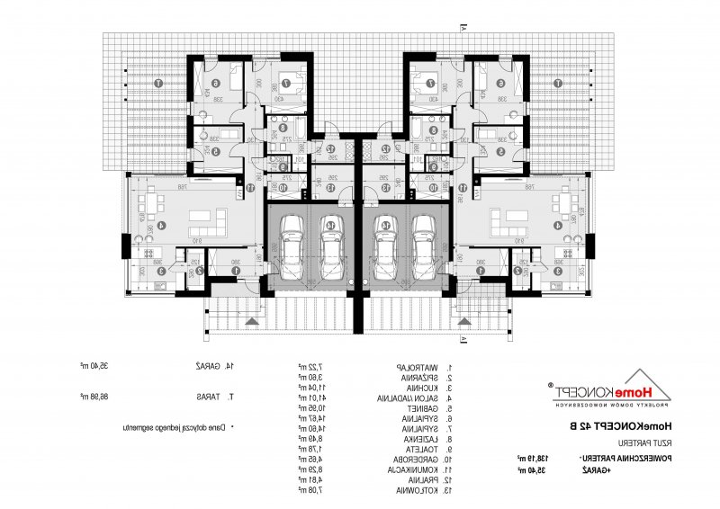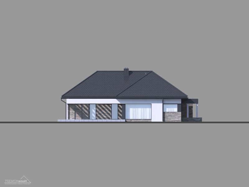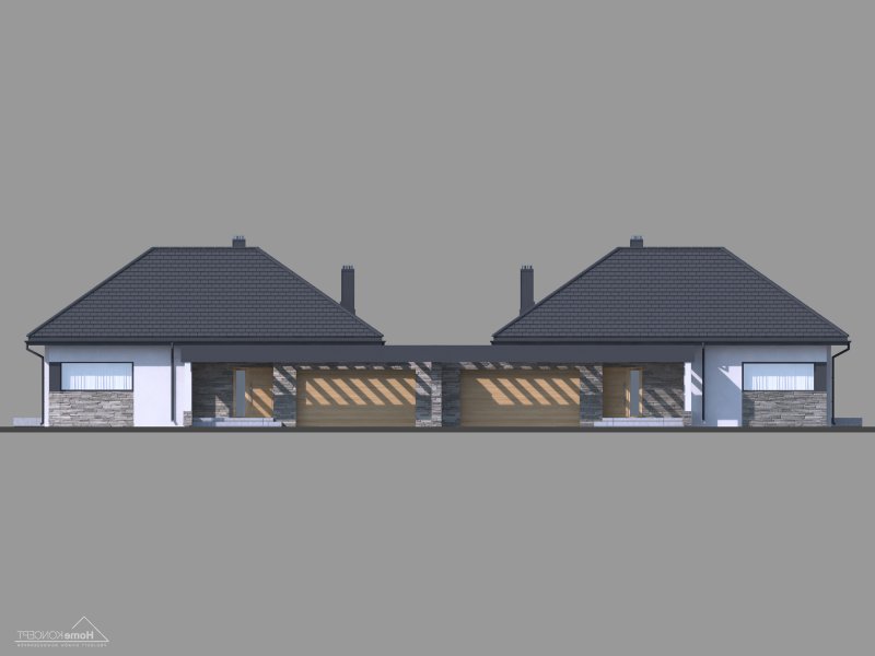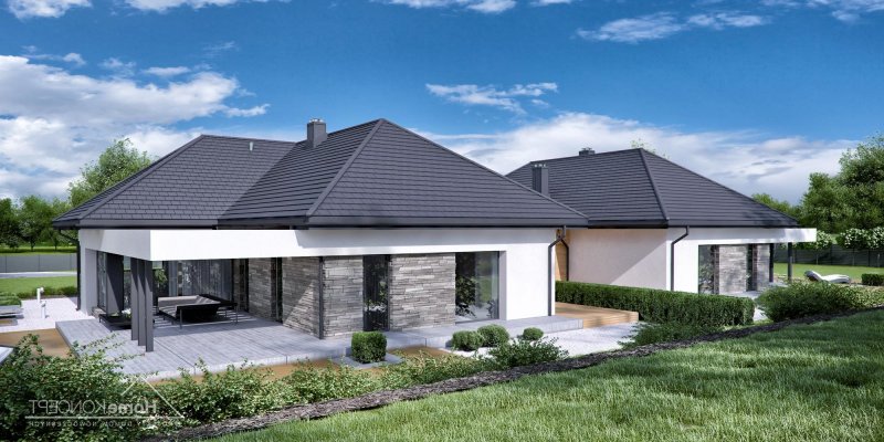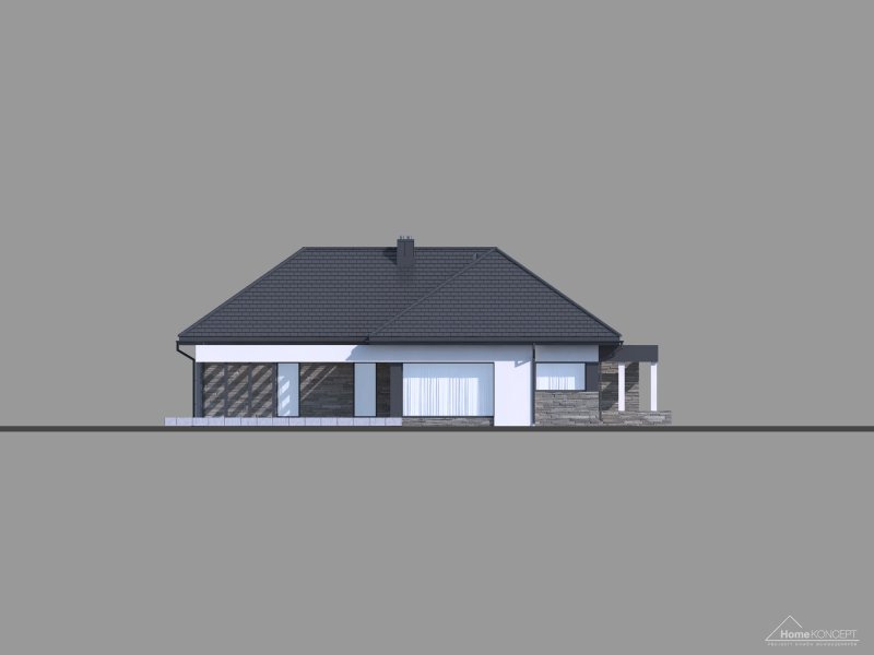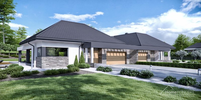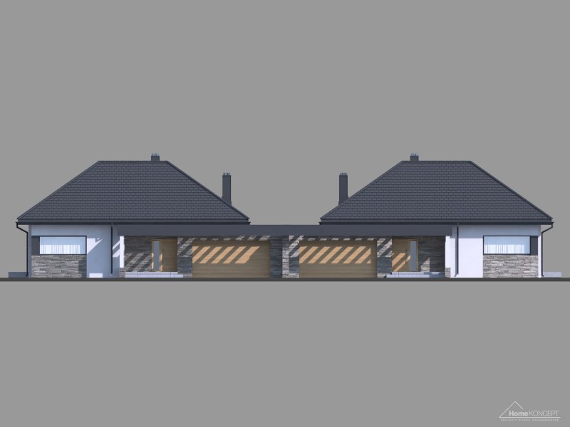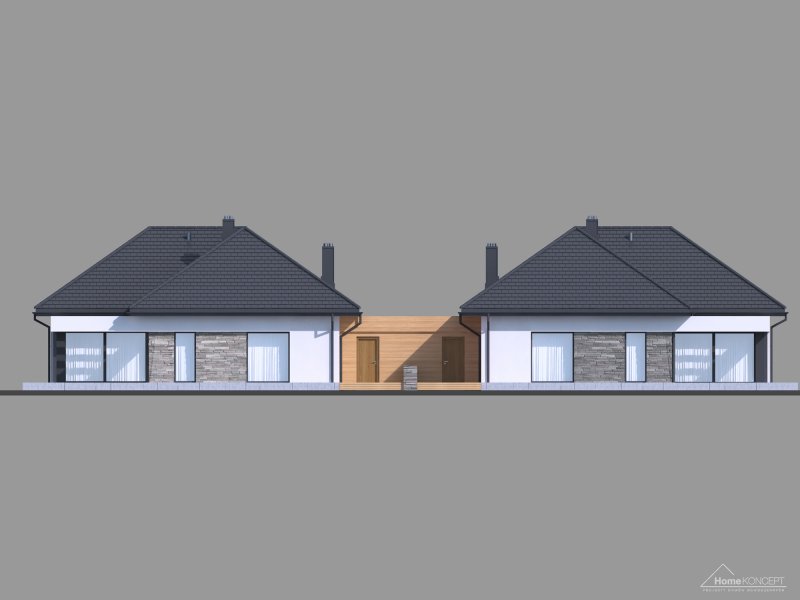 Projekt domu HomeKONCEPT 42 B to interesująca propozycja domu parterowego do zabudowy bliźniaczej z ciekawie zaaranżowaną, bardzo nowoczesną elewacją. Bryłę budynku podkreśla unikalne belkowanie ozdabiające strefę wejściową oraz osłaniające taras przed nadmiernym nasłonecznieniem. Stonowana kolorystyka elementów elewacji została skomponowana z naturalnego kamienia połączonego z tynkiem i antracytową dachówką. Bardzo duże przeszklenia doskonale doświetlają pomieszczenia i jednocześnie łączą dom z ogrodem.